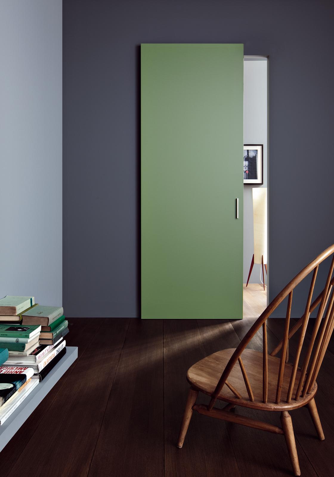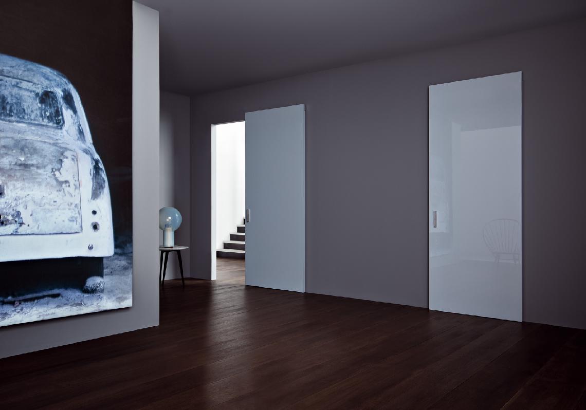 This sliding door can be seen as a beautiful surface simply laid against the wall. The technology is totally invisible and creates an effect of extraordinary lightness.