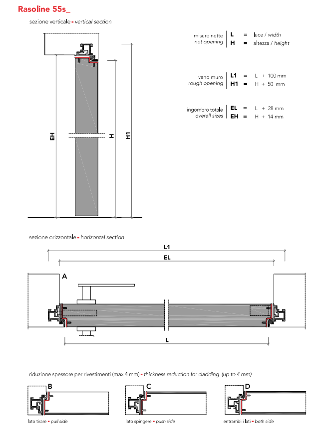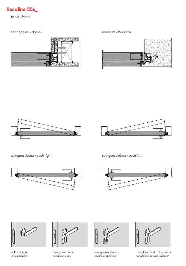 Swing wood door, with aluminium edge, 55 mm thick. Magnetic lockset, concealed hinges and anti-noise gasket included. Anodized aluminium frame to be installed without any subframe.