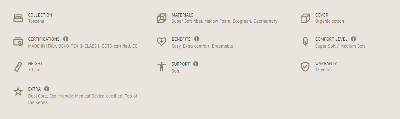 Cotton Grande Dual 12 of the Toscana collection is dedicated to those seeking relaxation while also being respectful of the environment. An all-natural comfort for a regenerating sleeping experience and a soft support at 30 cm of height. The GOTS certification issued by the Institute for Ethical and Environmental Certification is proof that the fabrics used to manufacture this line are made of organic materials, in full respect for man and the environment.