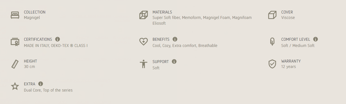 The New Magnigel Deluxe Dual 12 of the Magnigel collection, offers an unparalleled sensation of freshness, thanks to the innovative and breathable Magnigel Foam, which favors air circulation and maintains a constant microclimate between the body and the mattress. In addition, thanks to Dual Core technology, it ensures perfect comfort for the couple who have differing needs when it comes to the type of support they need for their body. Exceptional comfort and a soft support in 30 cm of height.