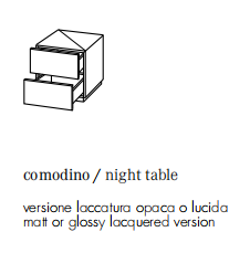 兩屜式木質45度斜切處理的床頭柜。有一下飾面可供選擇-啞光漆-亮光漆-左側為亮面漆,右側和后部和抽屜為啞光漆。 頂部由45度“切割”設計分成右側/前部和光面漆,右側/后部則是啞光漆。