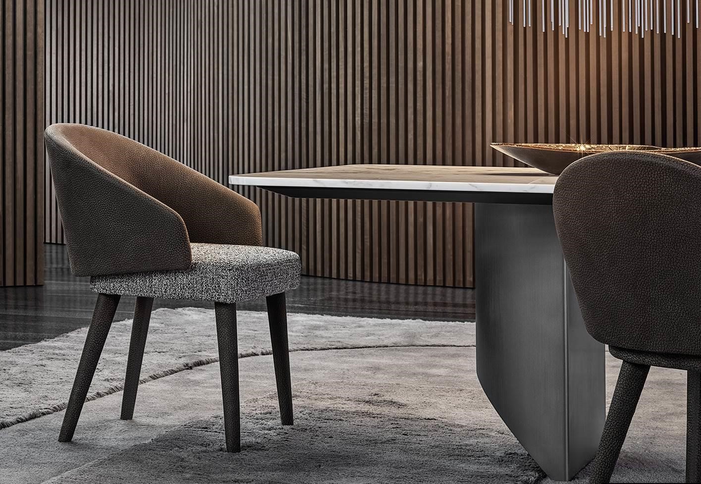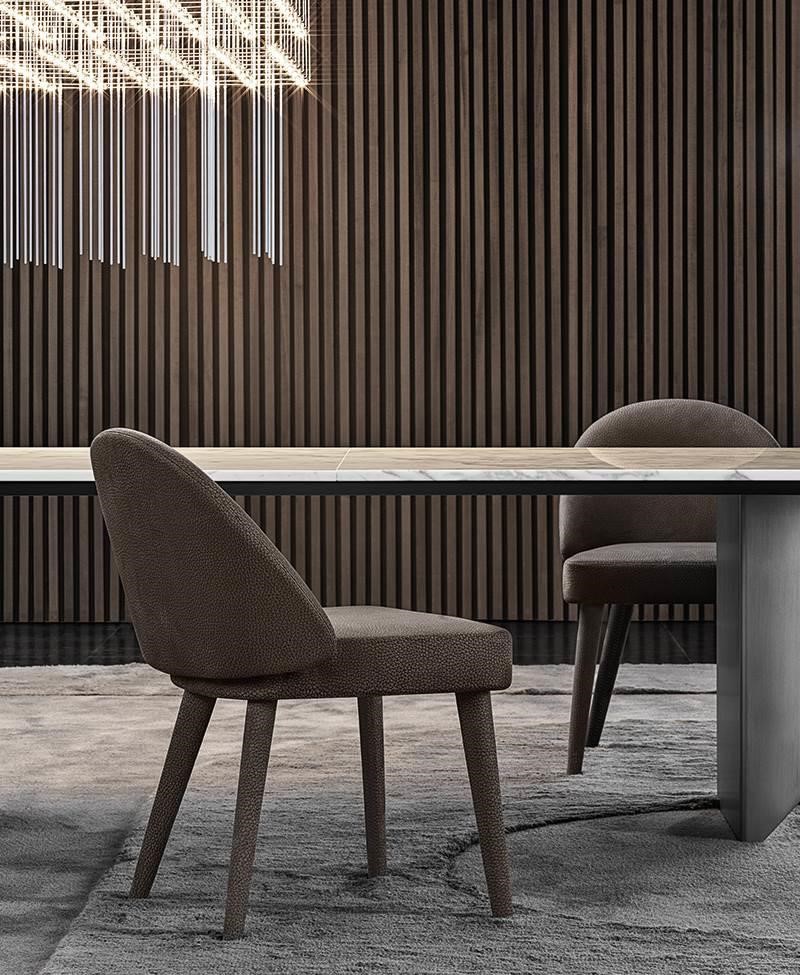 Sofas and armchairs sit on metal feet with a chrome or polished Pewter finish, a jewel-detail that adds a touch of sophistication to the piece. The wide variety of elements in the Lawson family also includes an armchair with legs in Moka-coloured ash wood or covered in leather, a detail that also characterises the lounge armchair and dining chair.