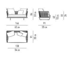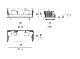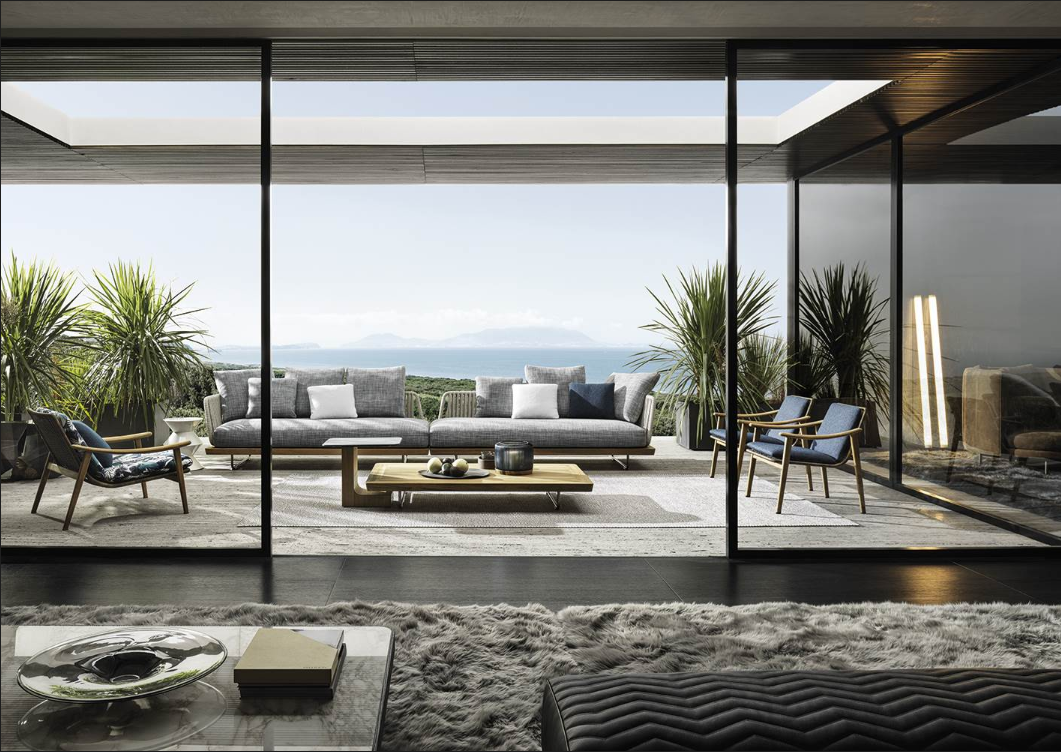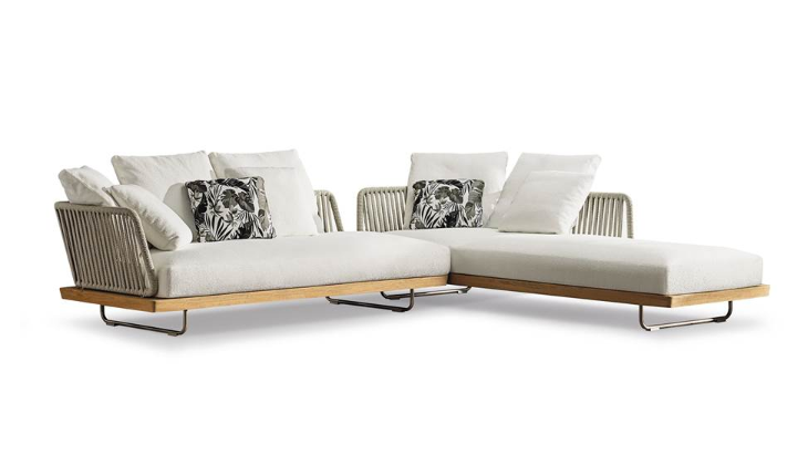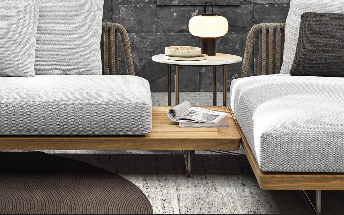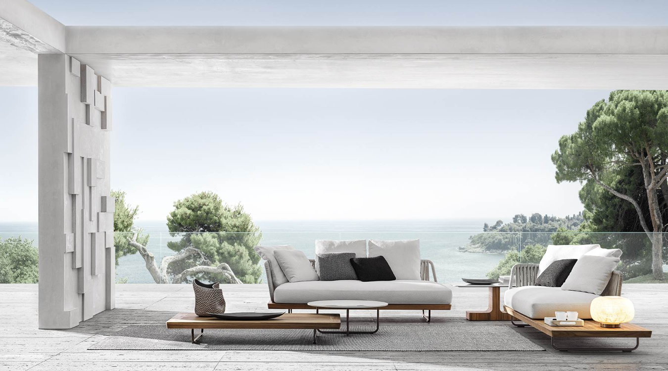 The system, composed of pieces that can be used alone or combined together, offers a variety of compositional solutions thanks to the high versatility of its elements. The family is composed of armchair, sofa, end element with or without extending top, chaise-longue, loveseat, daybed with reclining backrest, and square and rectangular coffee tables.