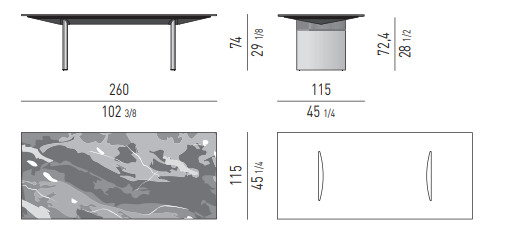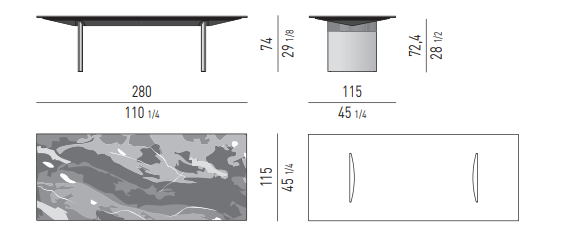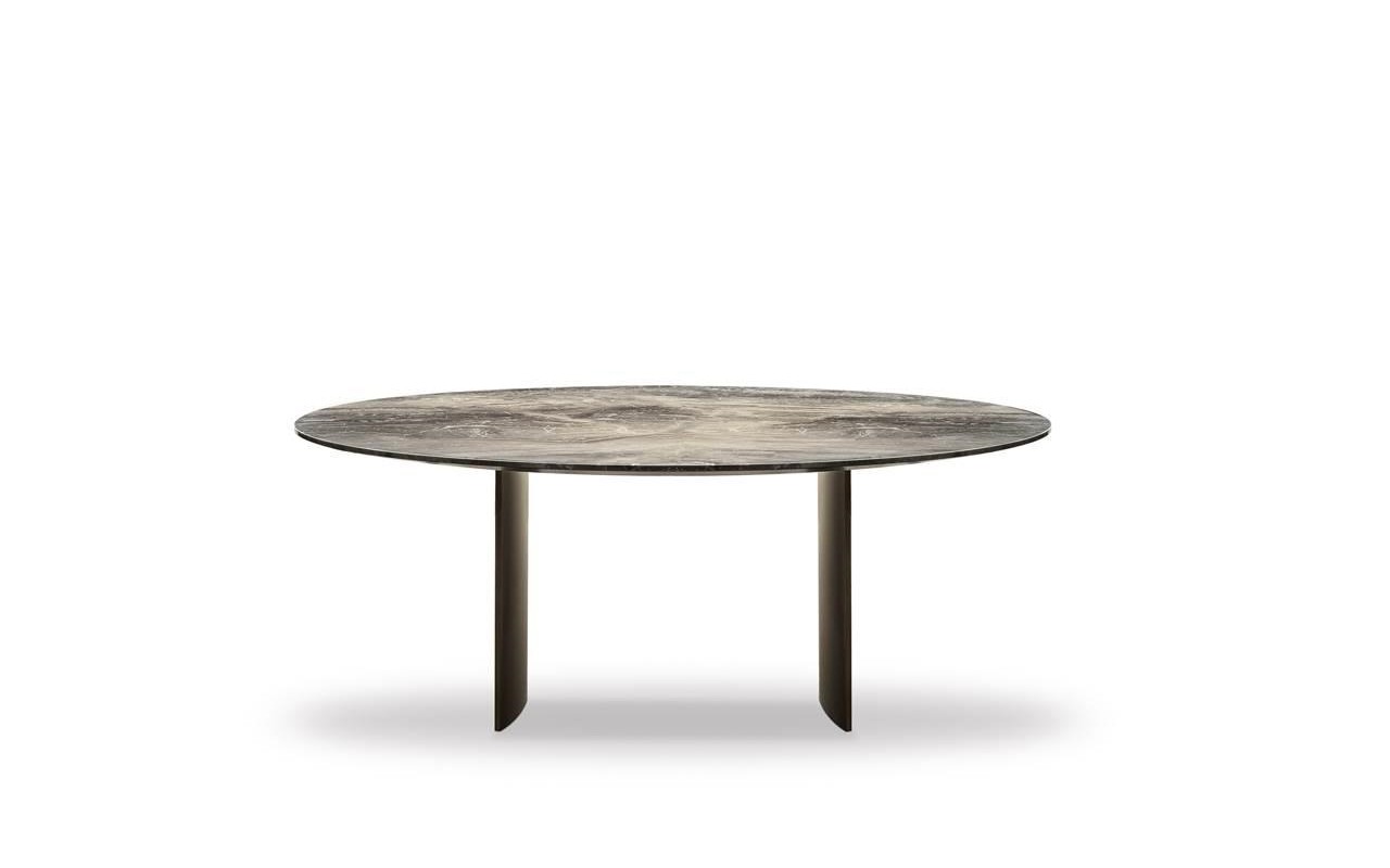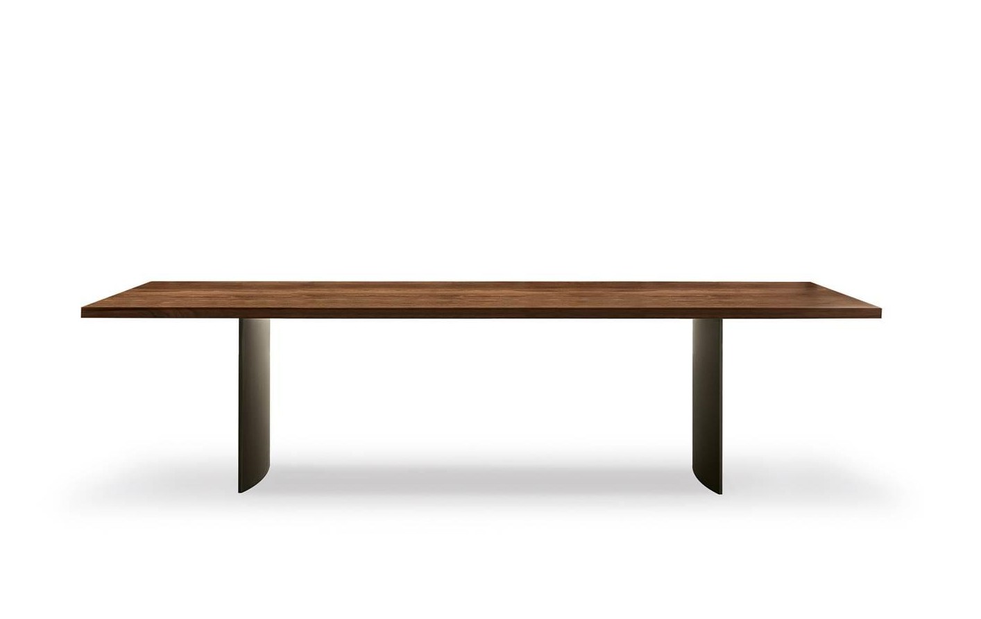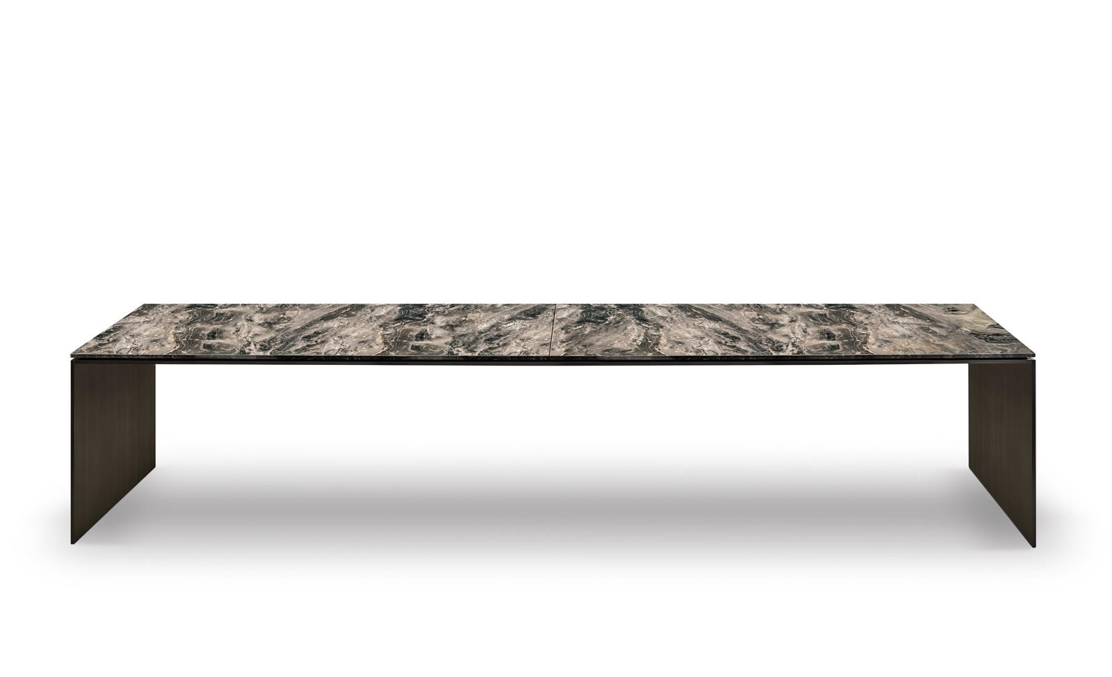 In the more sculptural version, the structure designs a bridge, with the top being flush with the sides, whereas in the other tables the blade-like legs, with the section curved on the inside, are set back from the top.