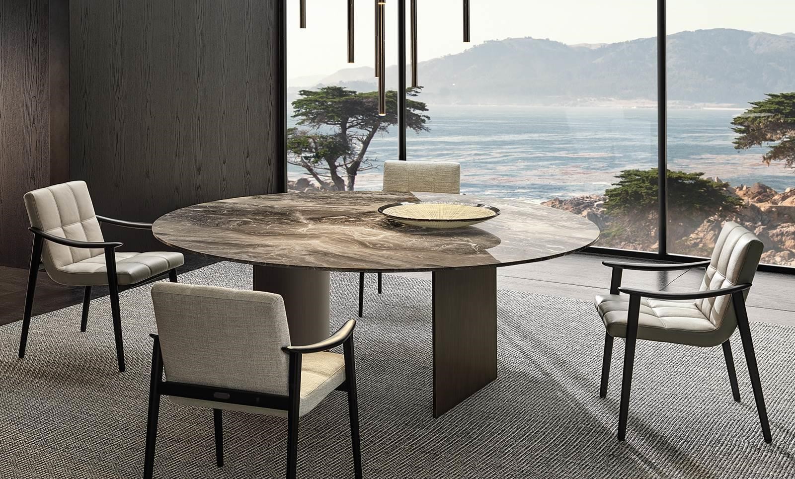 Linha, or “l(fā)ine” in Portuguese, is his response to the challenge of designing a dining table with a large span, a structure only 16 mm thick and a top that can reach up to 4 metres in length. Visually, it appears extremely lightweight and airy, despite the strong impact of the materials used, in which marble boldly takes centre stage.