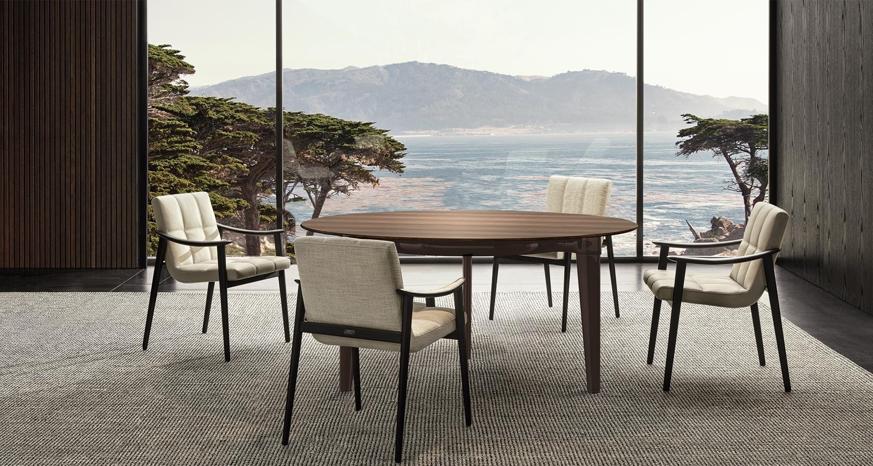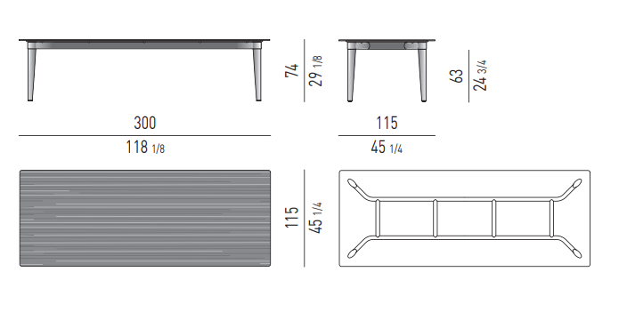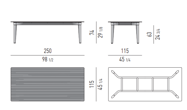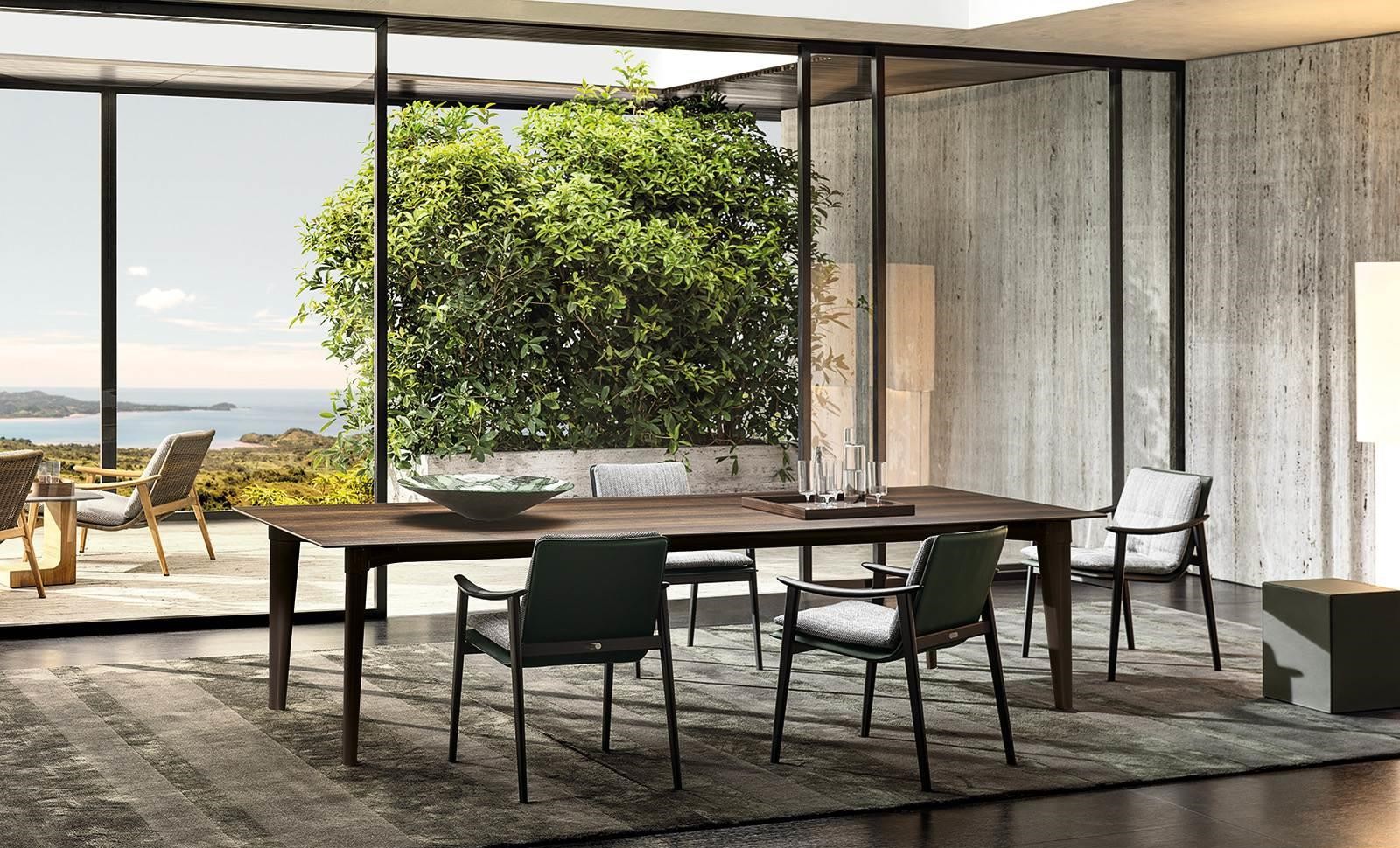 The colour of the legs in polished Pewter and the choice of a textured, pictorial wood define its sophisticated elegance, revealing an apparently minimalist, linear design. The tapered leg, also featured on the outdoor Terrace table designed by Rodolfo Dordoni, endows the piece with dynamism and a sensation of absolute lightness.