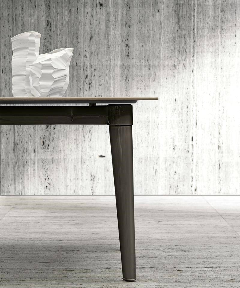 Tapered legs, with a soft, retro-inspired aesthetic and a stone-effect ceramic top, are the distinguishing features of the Terrace table, designed for use in open-air living spaces.