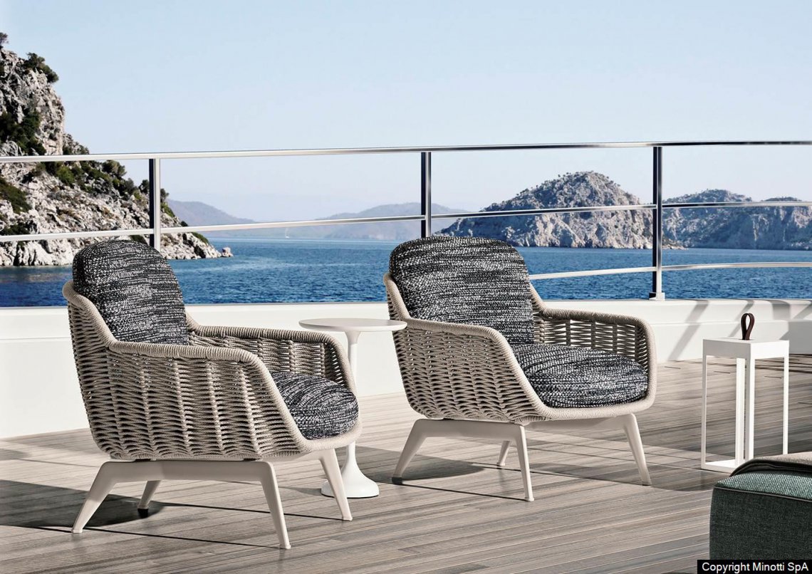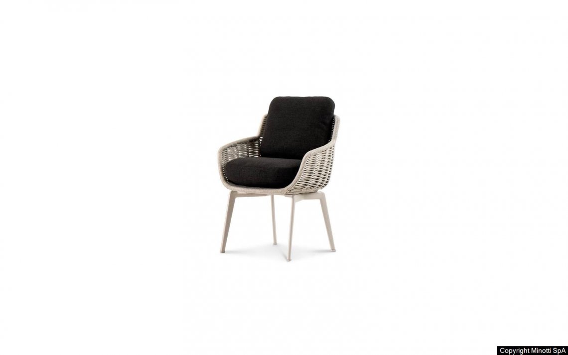 The seats rest on a matt varnished aluminium base, in the shades of Ecru and Dark Brown, reiterating the colours of the cord, and feature padded cushions with extra-durable polyurethane foam inserts, covered in water-repellent fibre and fabric.