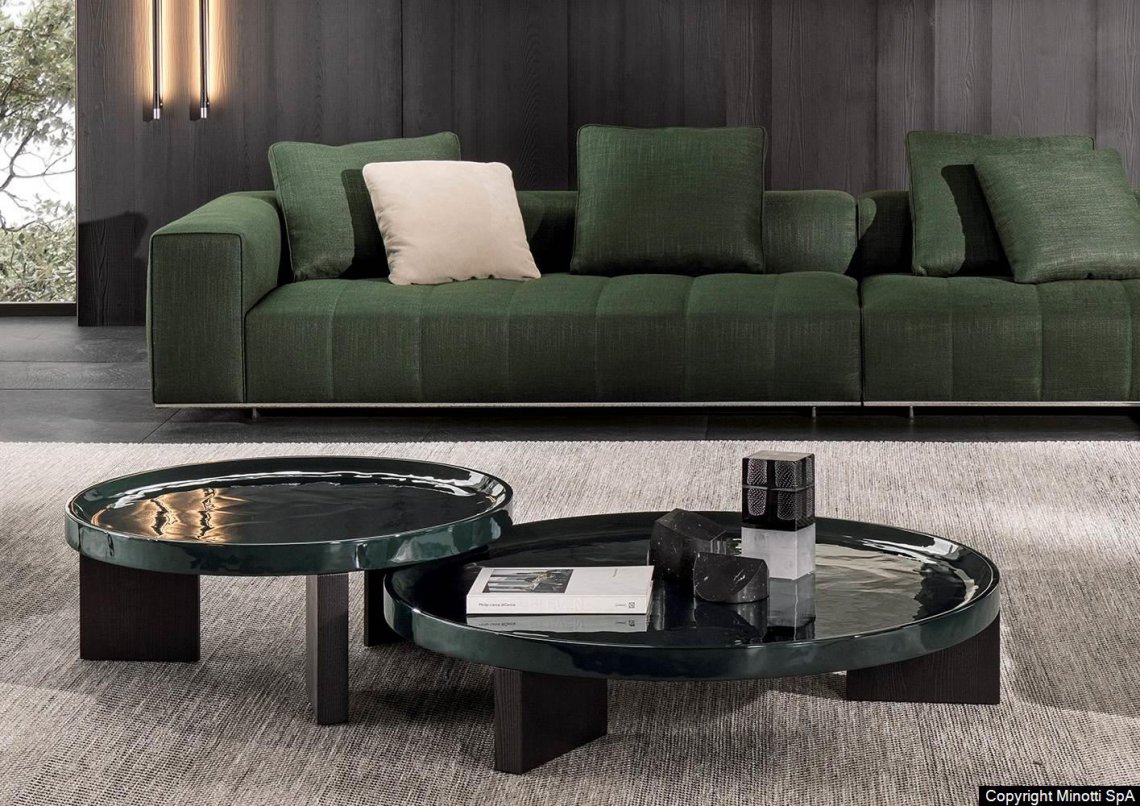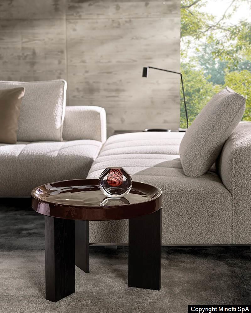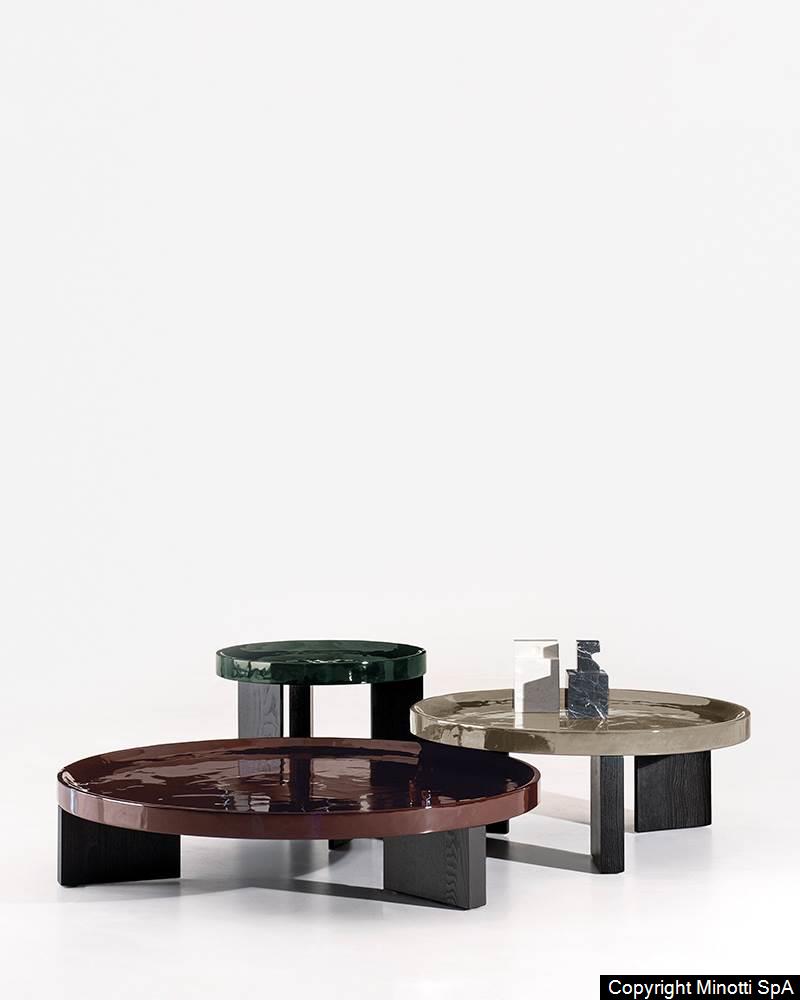 The nuances of the top reinterpret the Seventies vibe with a surface effect that moves the lacquer, making it not only shiny but also strongly textured. The combination of rational shapes and the discreet decoration of the top make it an unexpected coffee table, rendered elegant also thanks to its polished wood legs. Of all the coffee tables in the collection, it is the one with the most decorative inspiration, but always calibrated with a modernist taste, imbued by the combination of the thickness of the entire perimeter of the top and its surface.