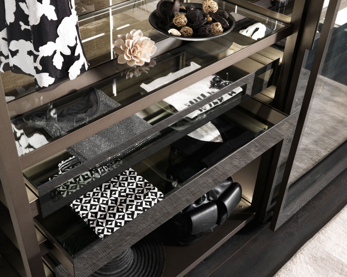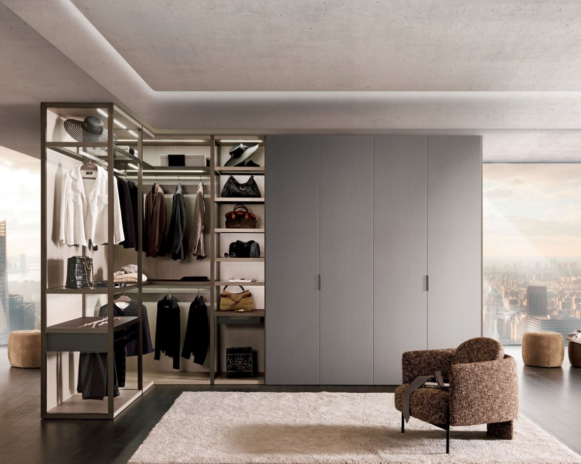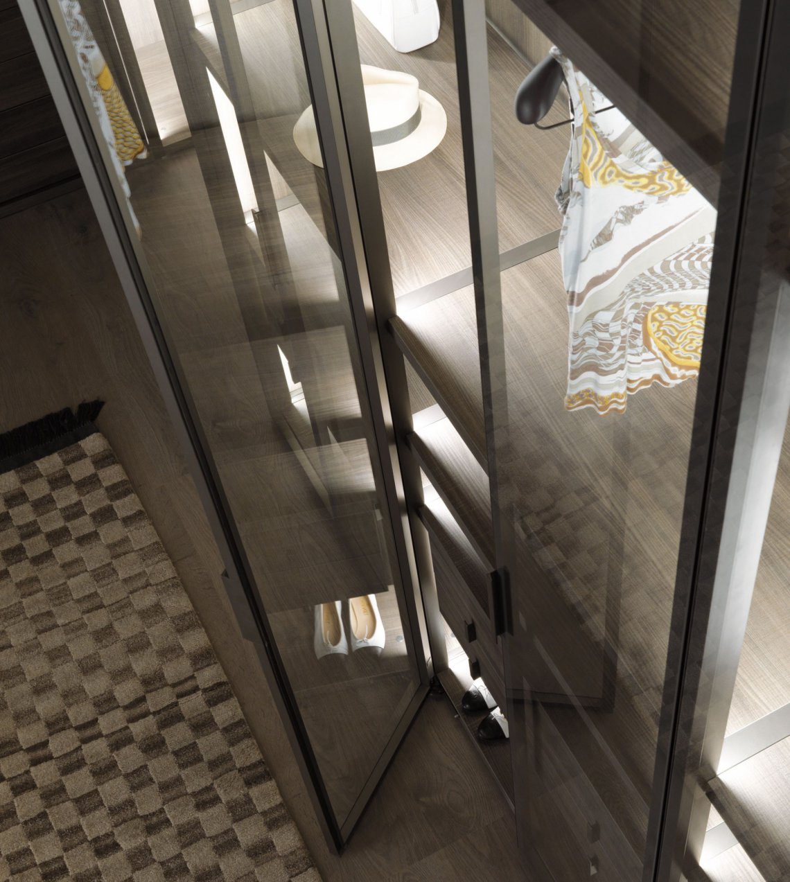 The evolution of Palo Alto I-Box, Palo Alto Free is the new wardrobe concept that calls for the use of doors directly supported by floor-to-ceiling posts that form the structure. This simple system for closing niches or separating spaces sustains a series of accessories for the compartments, similar to those of the Palo Alto I-box.