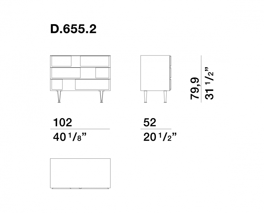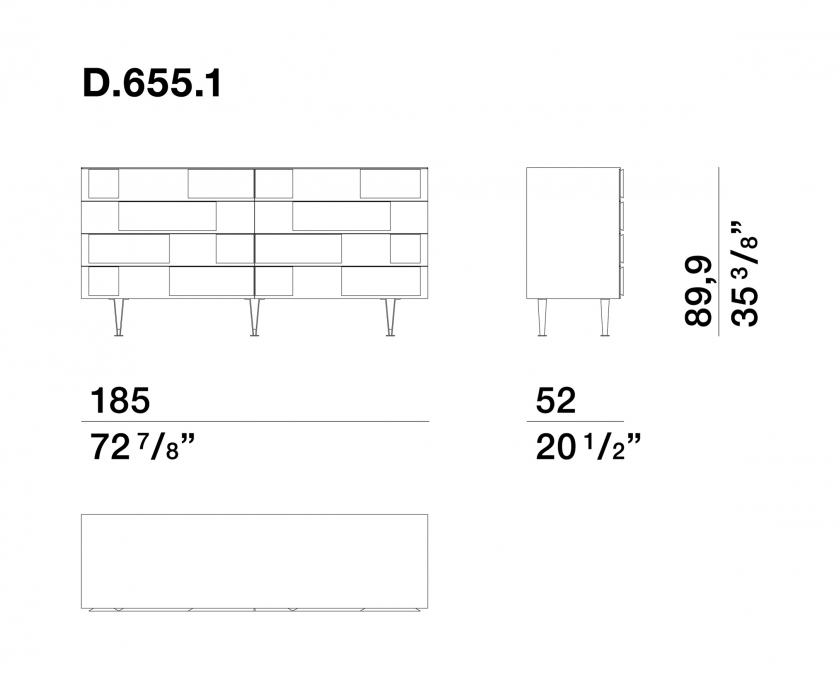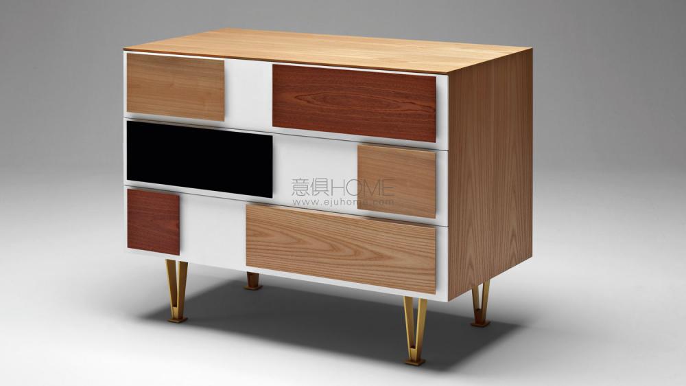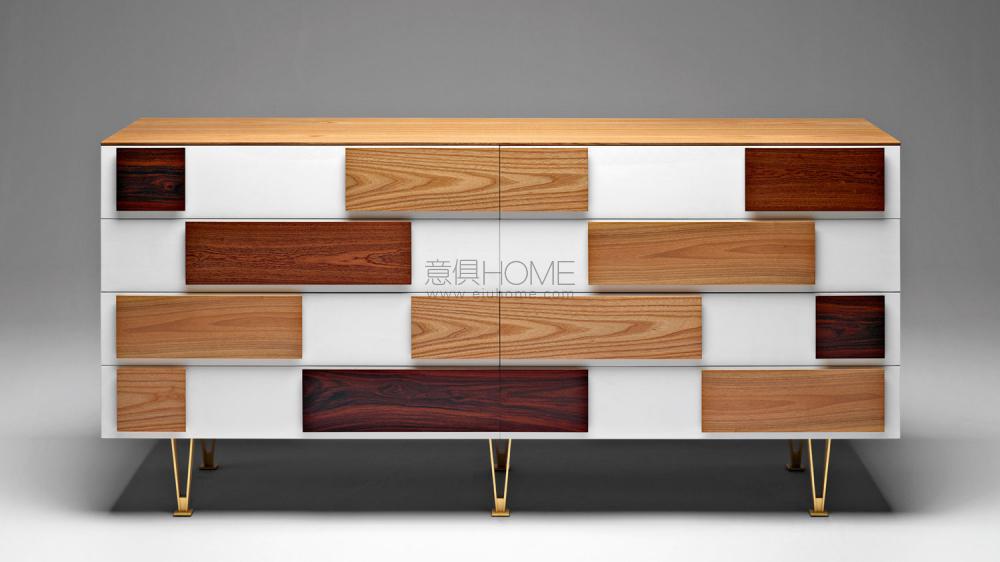 特征是手繪白色抽屜面和以各種珍貴木材作為抽屜把手(榆樹、意大利胡桃木、桃花芯木,花梨木)。設(shè)計(jì)師在1952~1955期間設(shè)計(jì)了多個(gè)抽屜柜型號(hào)。全新的型號(hào)是基于保存在Gio Ponti檔案館的原始圖紙,并在Cerri & Associati工作室的藝術(shù)指導(dǎo)下制作,榆木框架放置于緞面黃銅腳上。