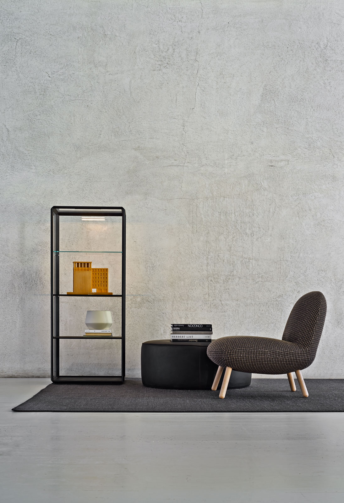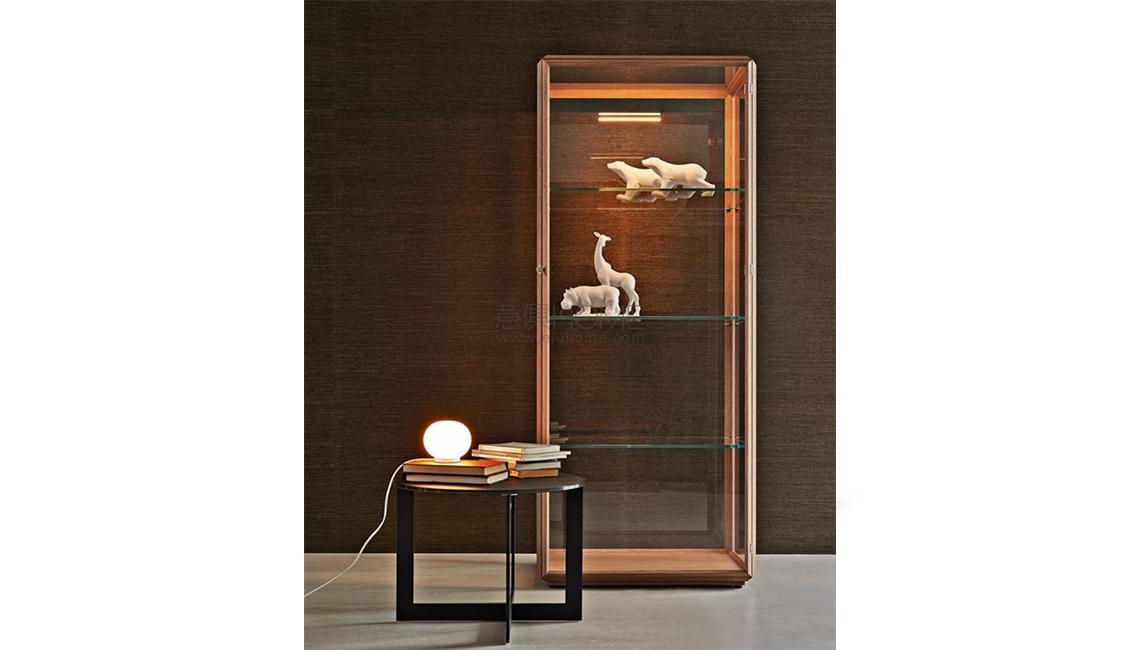 一個設計用來展示和儲藏珍貴物品和書籍的展示柜。呈現出一個透明的固體形狀,引人注目。通過層板的旋轉和傾斜,從傳統的90°角平滑過渡到45°邊角處理。幾何旋轉表面創造了45°平滑的邊緣,通過獨創的金屬連接件固定鋁制邊框,并用珍貴木皮包裹。開門裝置則完全隱藏,只露出一把側面邊框上的小鑰匙。