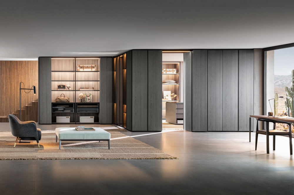 GLISS MASTER 衣柜系統(tǒng)裝備了一種新型的柜門(mén),柜門(mén)配有一套精巧的開(kāi)合機(jī)構(gòu): 系統(tǒng)7。這個(gè)設(shè)計(jì)項(xiàng)目的核心是一個(gè)獲得專(zhuān)利的折疊機(jī)構(gòu),可以將柜門(mén)輕松和安靜地 從最初的位置拉到隔間的一側(cè),讓隔間完全打開(kāi)。柜門(mén)打開(kāi)并且自身折疊,與相鄰的 隔間平行對(duì)齊,不會(huì)占用隔間前面的空間。系統(tǒng)7的機(jī)構(gòu)可以使用厚重的漆制、木制或立面定制酸性蝕刻的玻璃柜門(mén)。