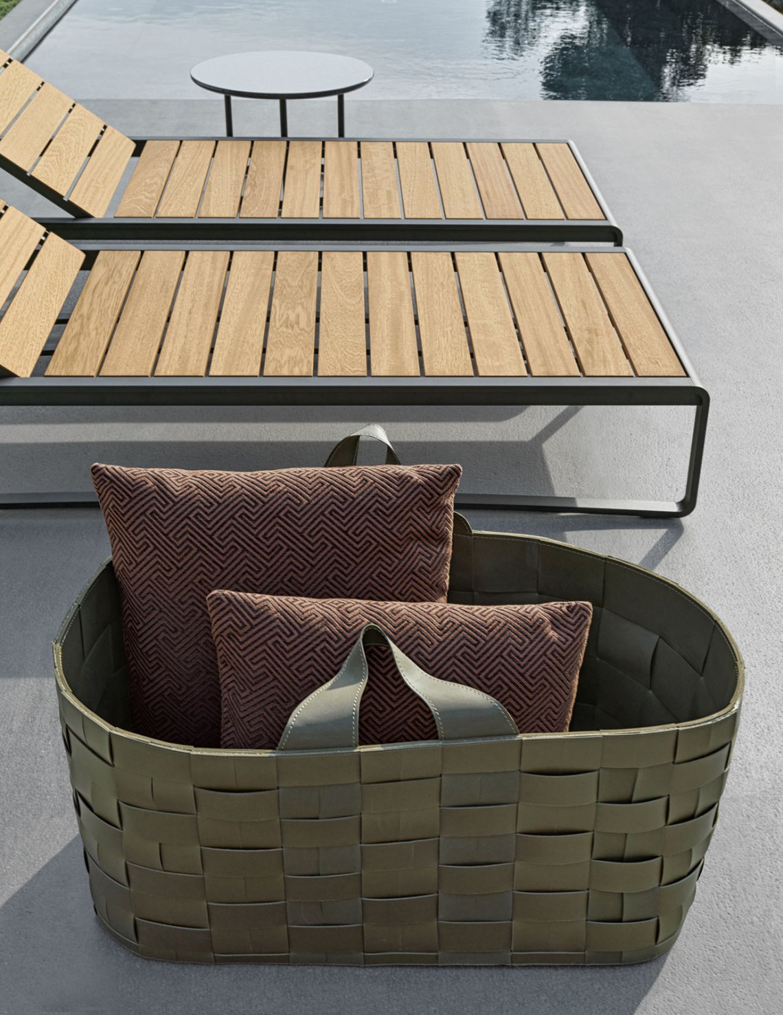 Practical, lightweight and easily movable baskets for towels or magazines are designed to create order and embellish outdoor spaces.