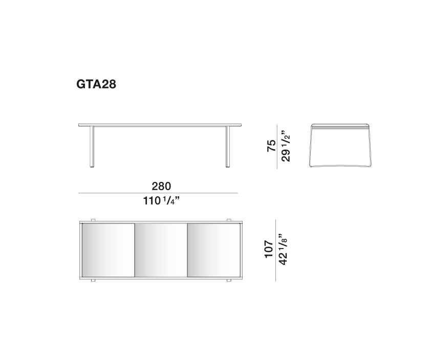 The structure takes up the motif of the burnished aluminium band, with its rounded profile and without corners. As in the entire Timeout Collection, the support bases are sled-shaped, created by the continuous movement of the same metal band and here positioned flush with the top as a natural continuation of it.