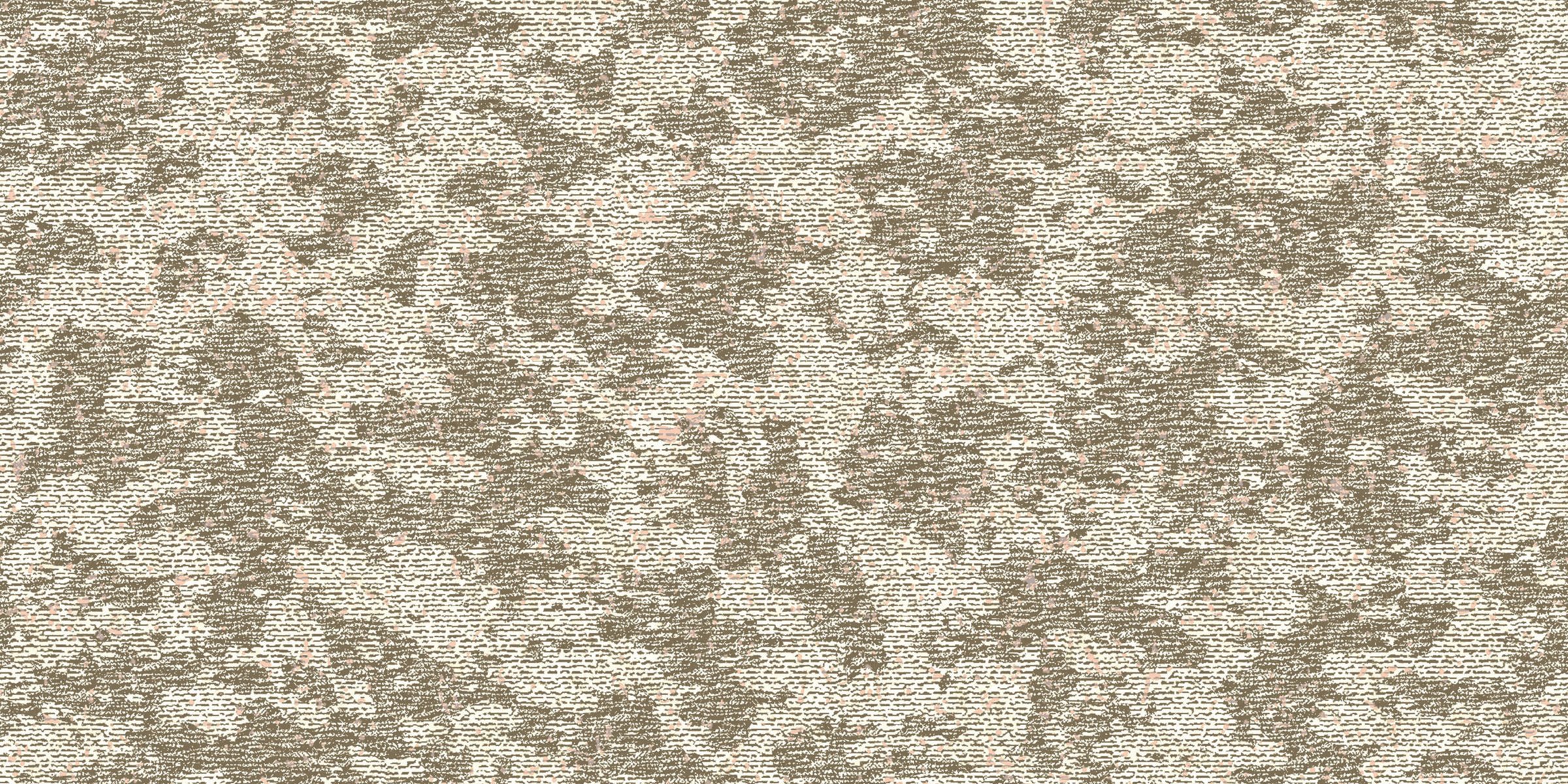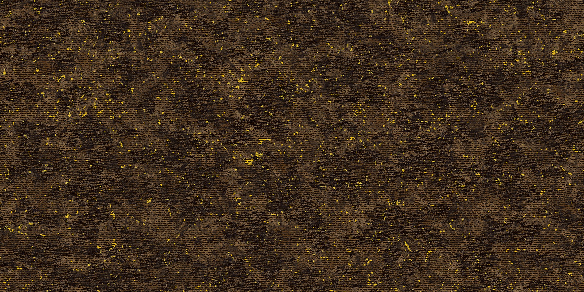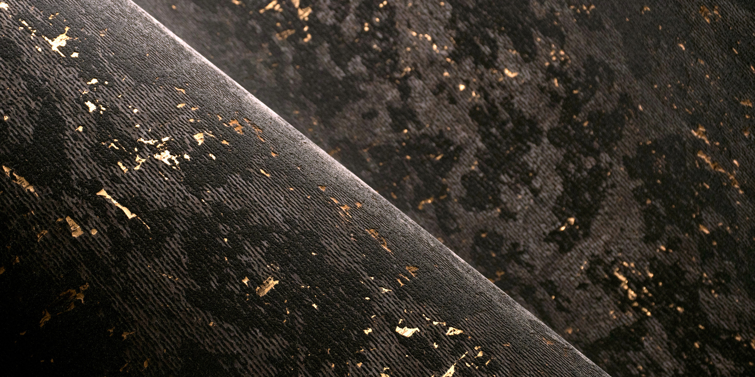 Foil based wallcovering lined with cork and a flock finish, based on the fur of the Bearded Leopard – pale yellow to deep gold, and a dark constellation of rosebuds adorning it.