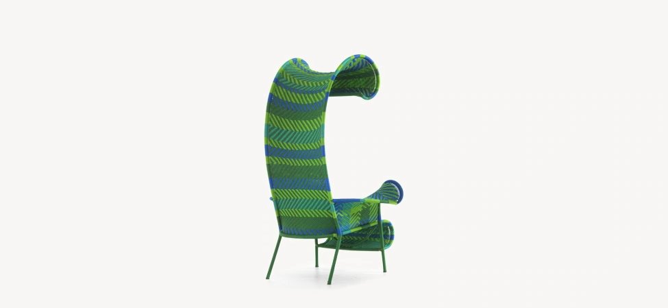 Struttura in acciaio verniciato e fili colorati in polietilene intrecciati a mano. Sottopiedi in PVC.