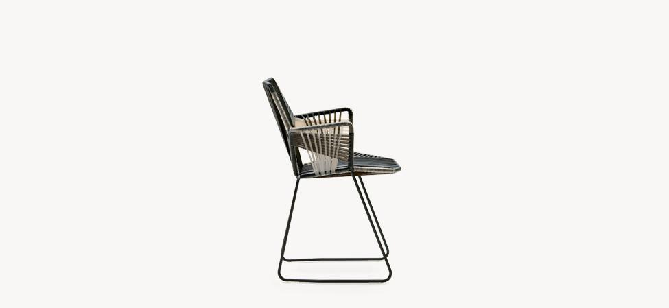 Struttura in acciaio inox o verniciato per uso esterno. Sottopiedi in PVC. Intreccio in filo tecnopolimero.