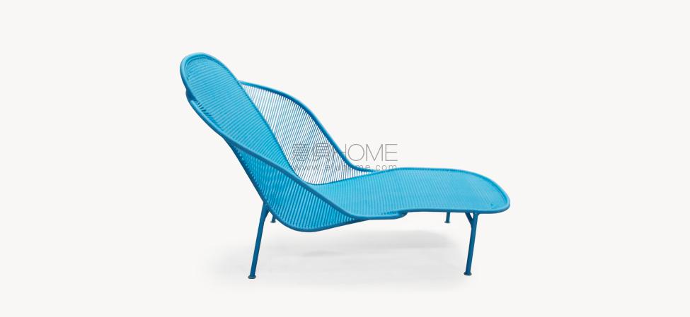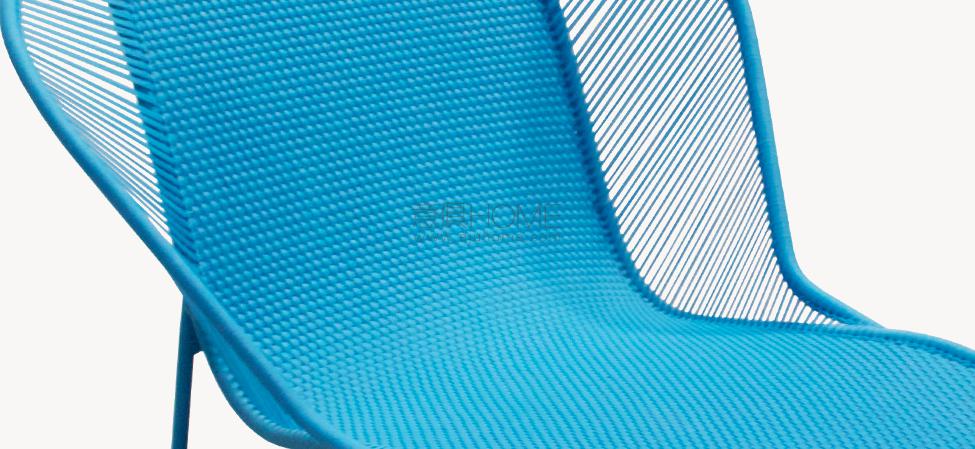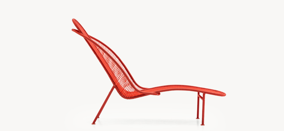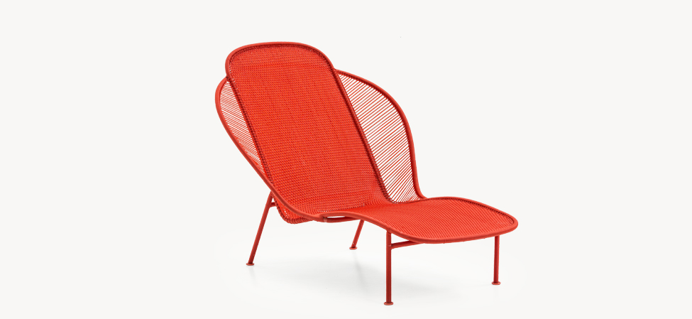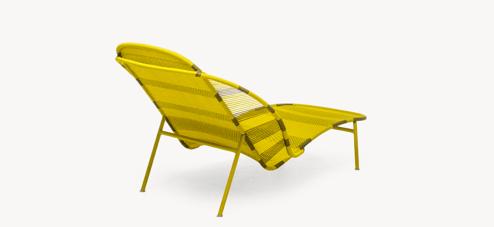 Struttura in acciaio verniciato e fili colorati in polietilene intrecciati a mano. Sottopiedi in PVC.