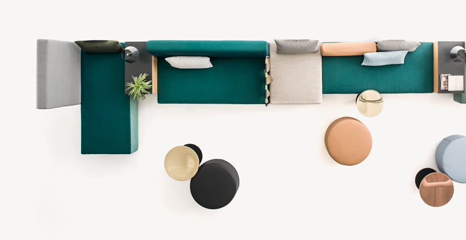 Progettare le relazioni, disegnare traiettorie per appropriarsi degli spazi che l’attualità dispone. Bikini è un paesaggio figlio del tempo e della società che lo esprime. Aree d’attesa, ambiente domestico, la flessibilità componitiva è legata alla mancata necessità di una corrispondenza tra conformazione dello spazio e disposizione degli elementi del sistema, che per varietà estetica e funzionale permettono una non comune trasversalità d’utilizzo. Sgabelli, tavoli, attaccapanni, contenitori, scaffali, separé, piani di appoggio e di seduta: ogni elemento concorre alla relazione e all’interazione. Un intreccio di funzioni e significati che sposta l’idea del divano da fronte televisivo o luogo del riposo a epicentro (aperto) di relazione.