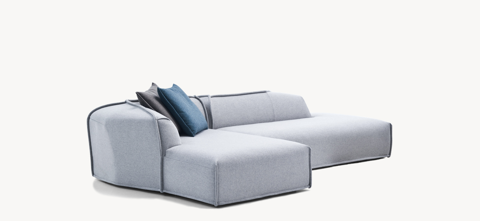 chi smussati dal taglio di una lama immaginaria. L’ordine geometrico è rotto, travolto a favore di un movimento, di un margine che attraversa i perimetri. Le facce rendono evidente la nervatura; alcune cuciture, evidenti come imbastiture, la disegnano, altre scompaiono. L’utilizzo è libero, la superficie morbida. La forma esterna, dal punto di vista dei volumi, appare indipendente dalla struttura e dall’imbottitura interna. Divano, poltrona, poltroncina: un sistema componibile dove ogni elemento mantiene indipendente il carattere, per funzione e presenza scultorea.