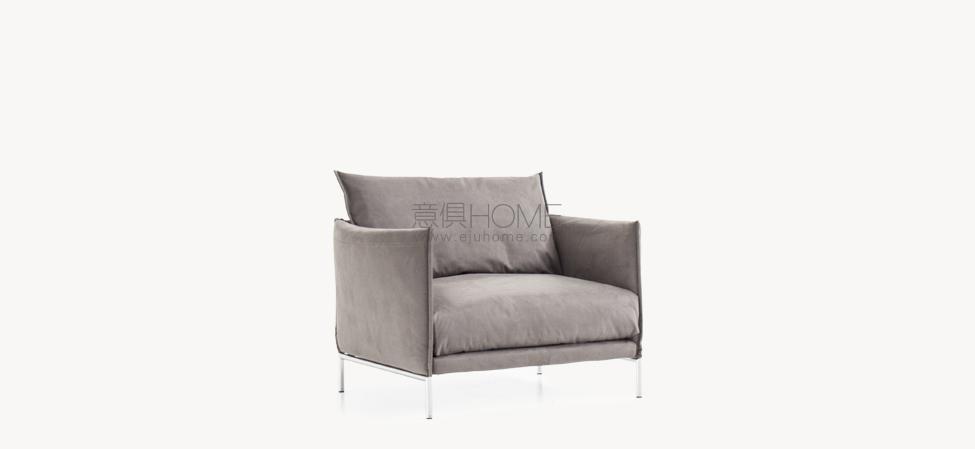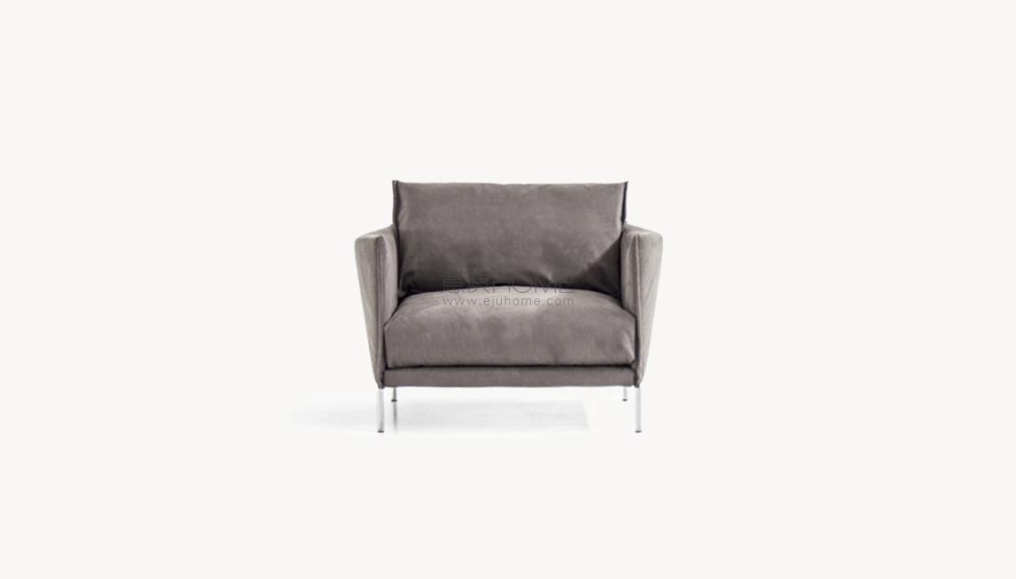 Espanso schiumato a freddo ignifugo e fibra poliestere con struttura interna in acciaio. Piedi a ponte in tubo di acciaio cromato o verniciato a polveri. I cuscini dello schienale, del bracciolo e quelli opzionali sono in piuma d’oca. La collezione Gentry è sfoderabile.