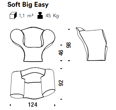 Una collezione che, da Big Easy, poltrona in acciaio realizzata da Ron Arad nel 1988, dimostra come un volume, in quanto semplice forma, può essere tradotto, senza pregiudicarne i principi progettuali, attraverso una reinterpretazione dei materiali e dei processi produttivi. Il modello ottenuto dal gesto costruttivo diventa così produzione industriale; la morbidezza visuale e la pienezza dei volumi, comfort. Big Easy esplora lo stampaggio rotazionale e l’uso del polietilene; nella versione Soft la schiumatura a freddo e, con il rivestimento in fibra di poliestere, la trasformazione tattile della superficie; negli elementi della collezione, la morfologia e la dinamica della forma.