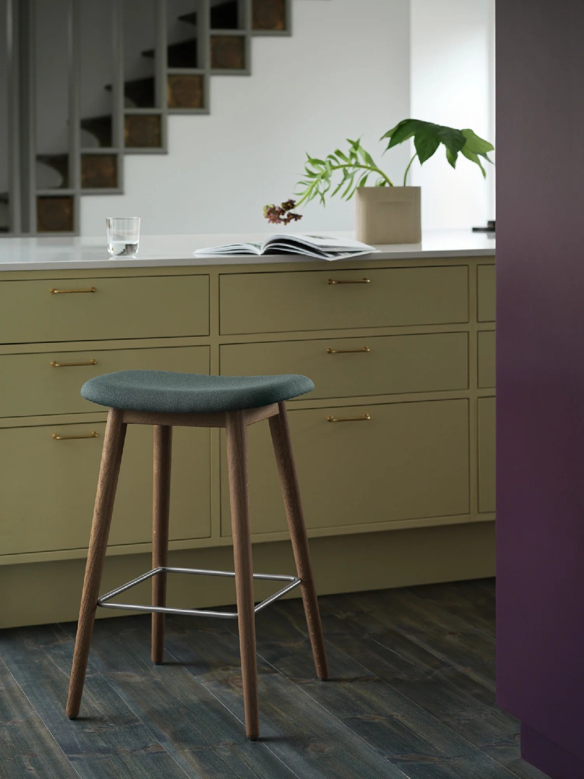 With an expression that is at once comfortable and harmonious, the Fiber Bar Stool is a design with an unobtrusive yet distinct identity. With its shell made in an innovative composite of plastic and wood fibers, the Fiber Bar Stool has a textured, matte surface and soft, inviting touch, paired with its embracing seat. Designed in two different heights, both available with or without backrest, the Fiber Bar Stool encapsulates the ideals of simply modern design with a human touch. When viewed from afar, the wood fibers of its shell blend into the surface for a matte finish yet appear when viewed up-close for a modern sentiment, joined by a wooden base.