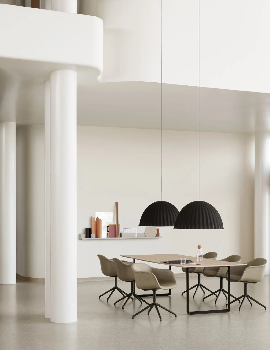 Designed in a material that uses up to 41% fibers from recycled plastic bottles, the Under The Bell Pendant Lamp not only brings a tactile and modern expression to any space but also impacts the acoustics of a room through its soft shade, paired with its graphic lines and subtle color palette.
