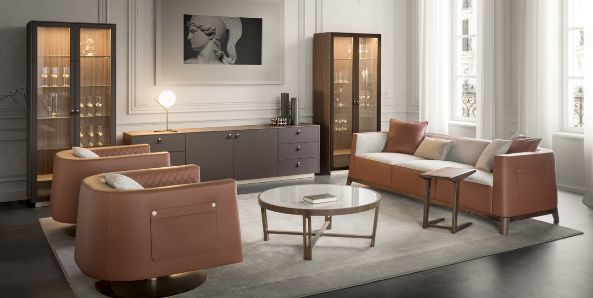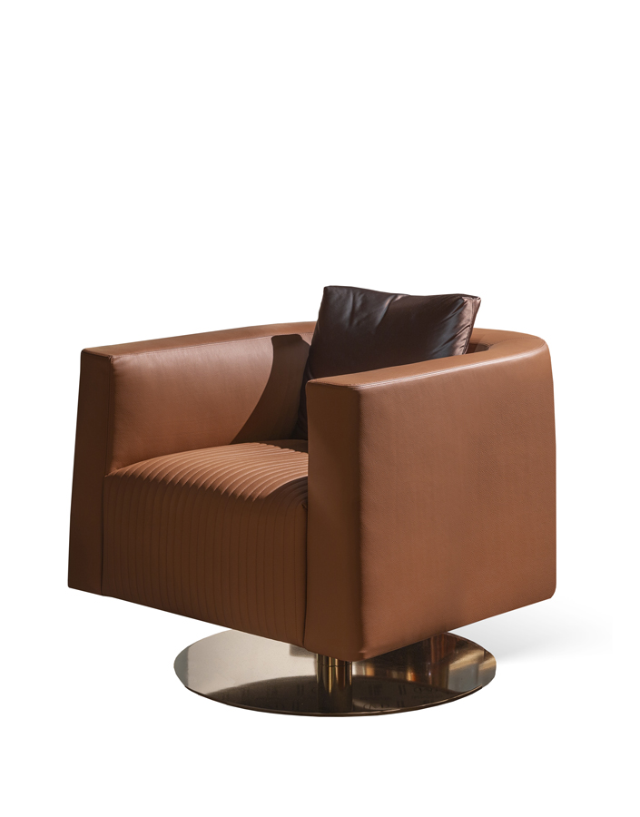 Poltrona con base girevole in metallo. Rivestimento in tessuto o pelle. Tasca portariviste su un lato.