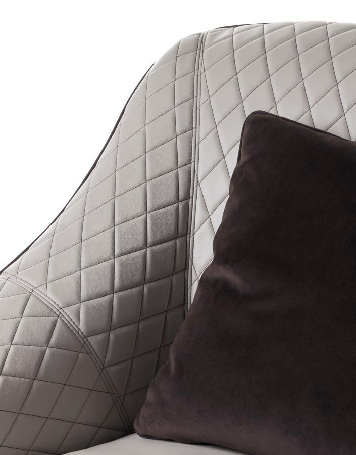 Poltrona con struttura in legno e rivestimento tessuto o pelle. Piedini in legno.