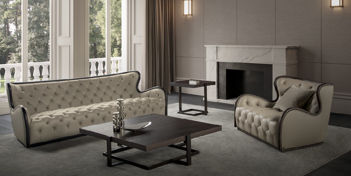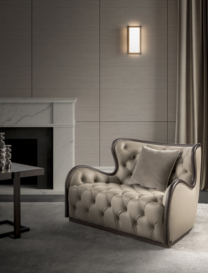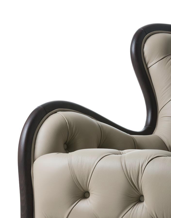 Armchair with wooden structure and capitonè. Upholstery in fabric or leather.