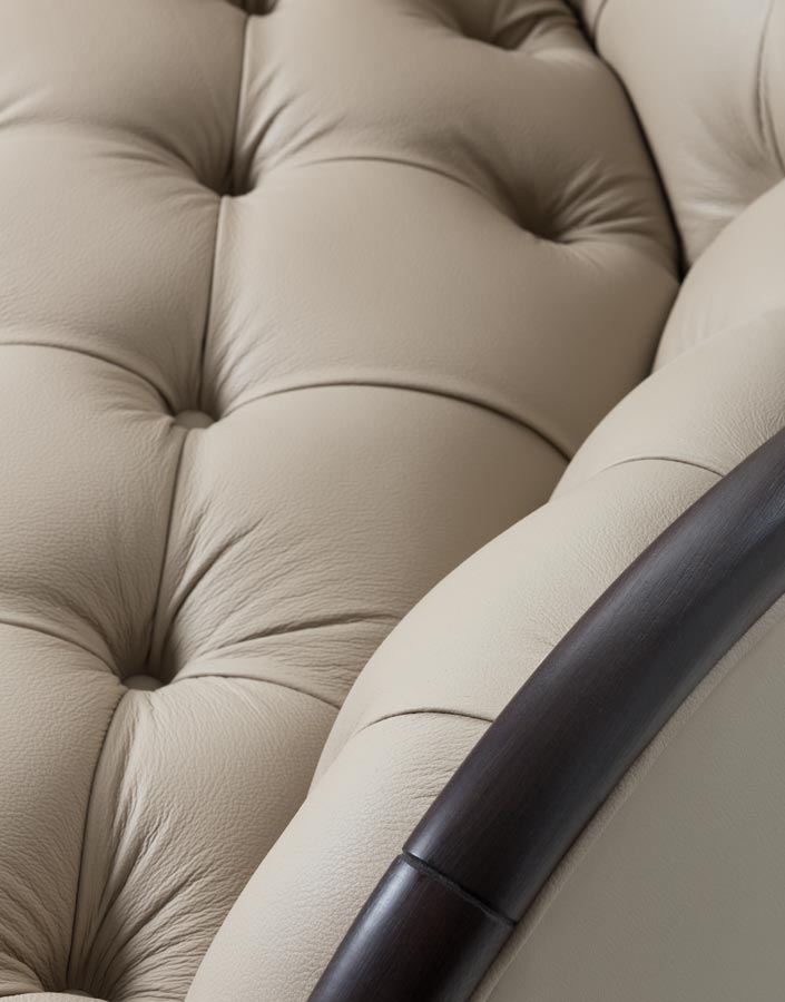 Poltrona con struttura in legno e lavorazione capitonè. Rivestimento in tessuto o pelle.