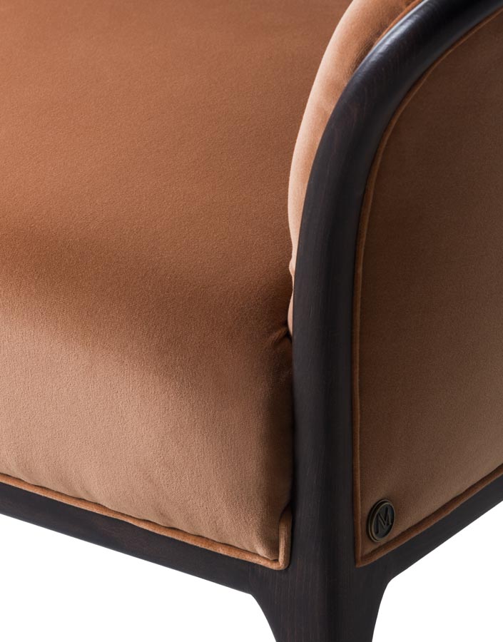 Divanetto con struttura in legno, seduta liscia e schienale capitonè. Rivestimento in tessuto o pelle.