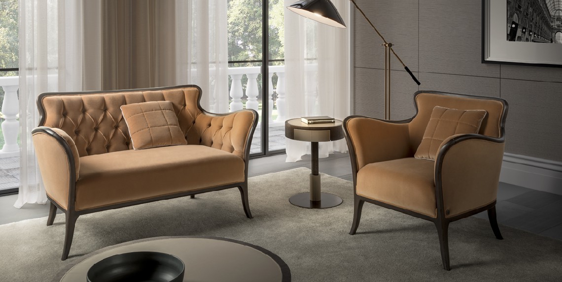 Poltroncina con struttura in legno e rivestimento in tessuto o pelle.