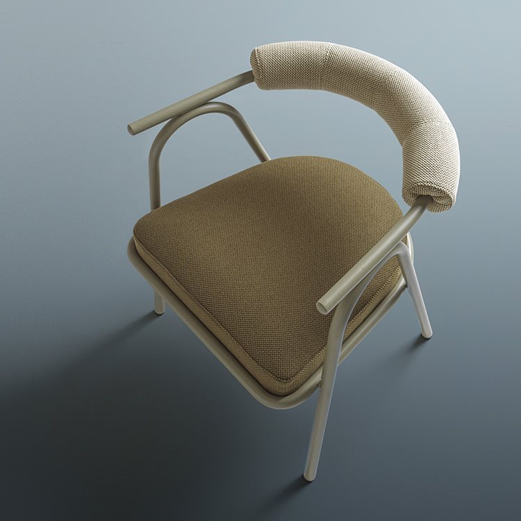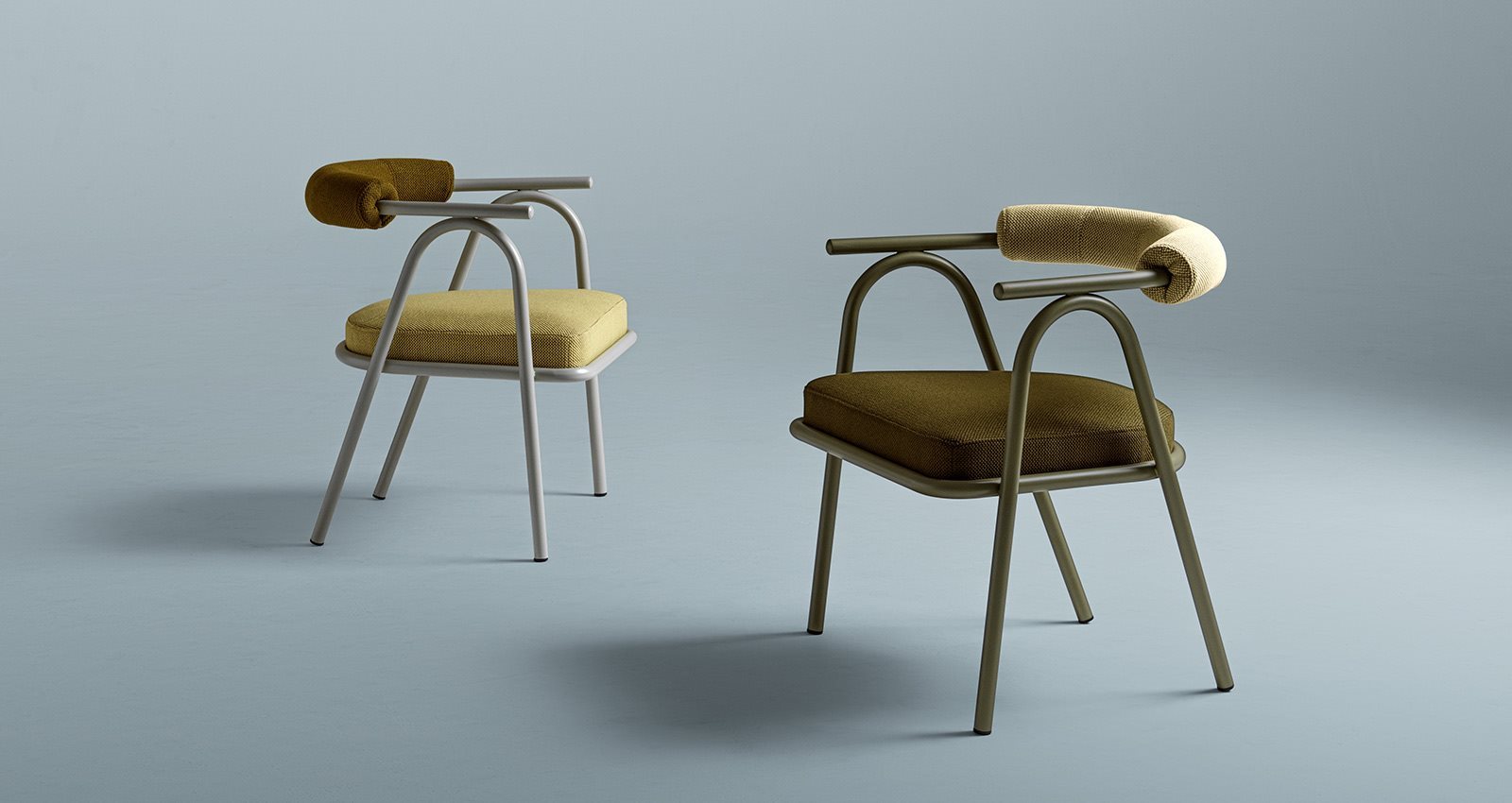 Baba armchair by SerenaConfalonieri, which play the starring role in a fun game of colours and contrasts that draw their inspiration from traditional clothing and accessories used by African tribes, with the brighthues of tropical flora and the warm hues of the soil. The contrastis further emphasised in the pursuit of volumes between the backrest and seat, and the slim line monochromatic body that moves sinuously across the soft shapes of the padding.