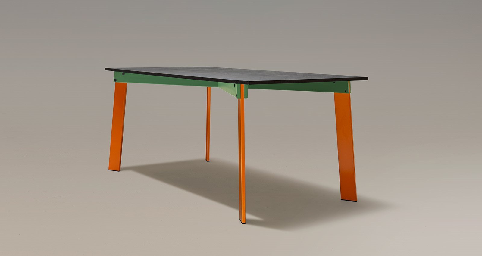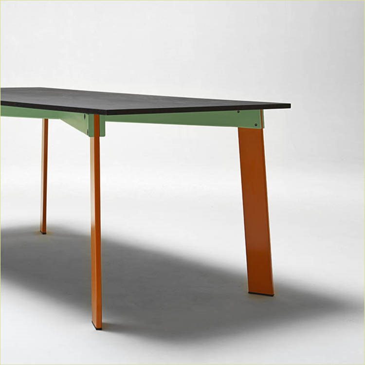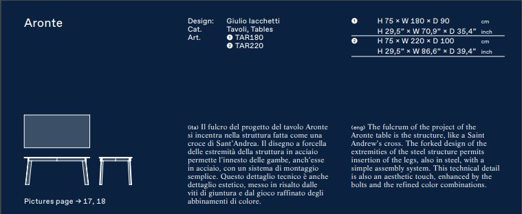 The main feature of the Aronte table designed by Giulio Iacchetti is the design of the structural cross of the base. Made in iron, its beams have a forked opening at the extremities, to permit insertion of the legs – also in iron – attached by bolts that providea unique aesthetic detail while performing their technical function. Resting on the crossed structure, the top is available in matte painted MDF or marble. Aronte comes to life in a game of color combinations, thanks to the possibility of ordering the top,structure and legs in three different hues.