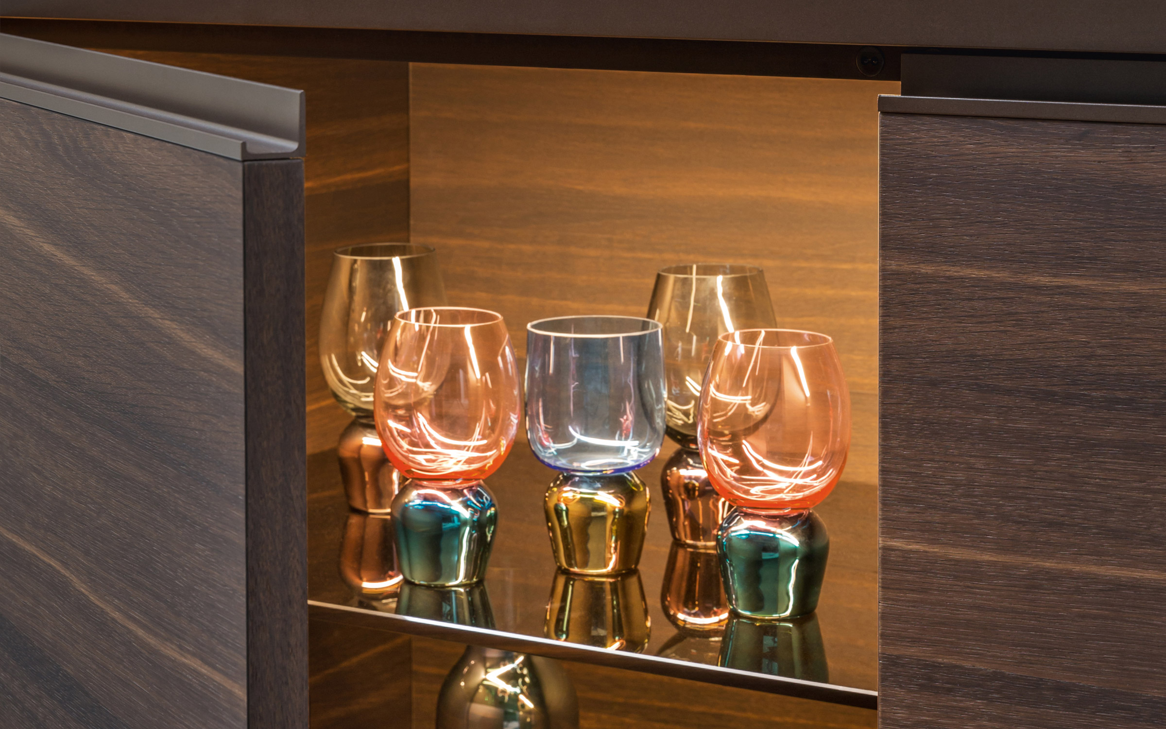 The coffee-brown oakwood structure supports a top available in four luxurious finishes: matt or polished gold Calacatta marble, bronzed or brushed glass. The internal compartments are fitted with clear bronzed glass shelves with doors fitted with elegant bronzed handles. When the doors are opened, the sensors automatically activate the lights fitted inside.