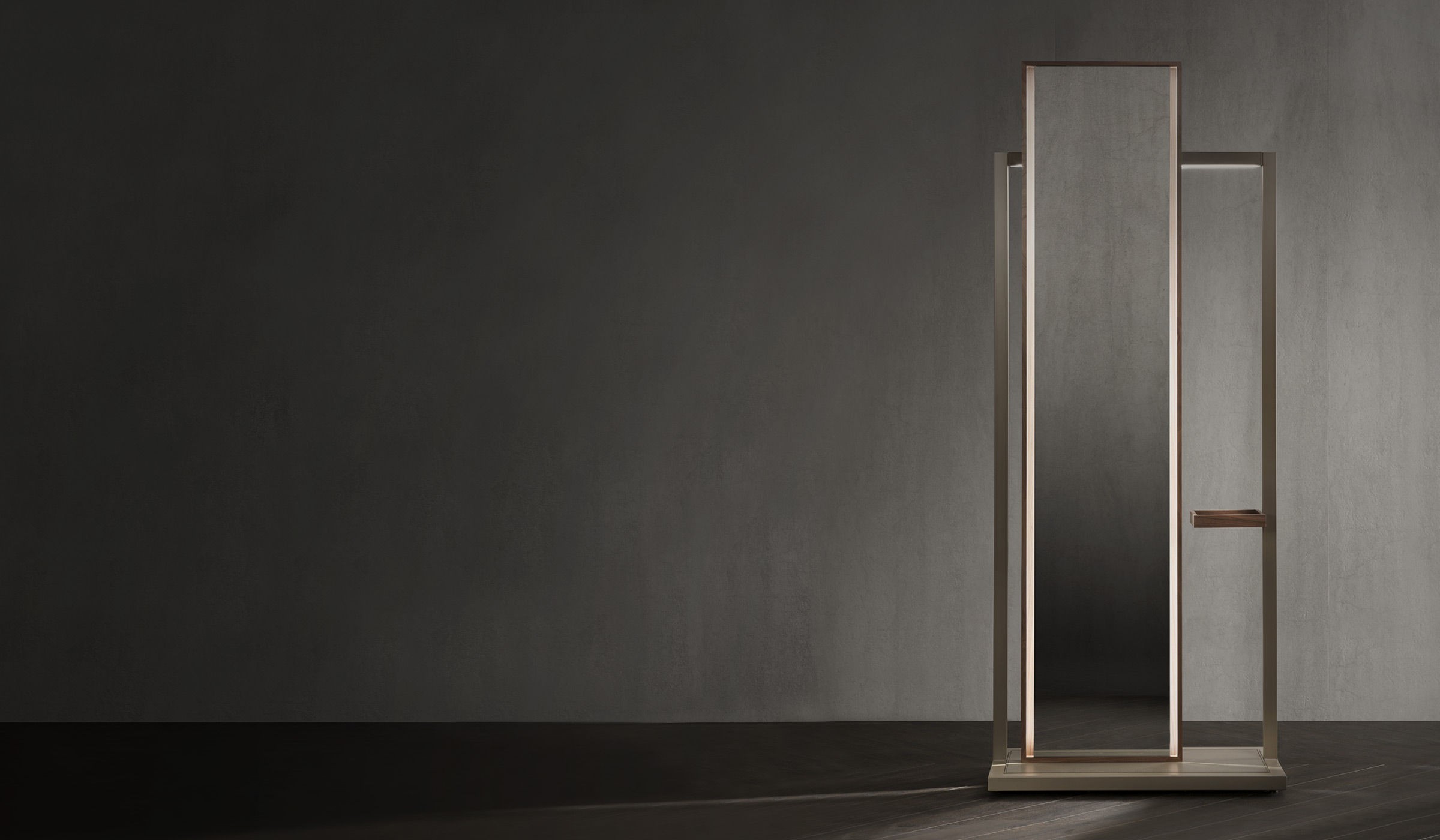 The free-standing mirrors/clothing racks reflect the lines of other articles in the Continuum collection. The support structure is steel (available with an anodic bronze or gris sablé finish). Two versions are available: the first has a series of small vertically stacked drawers; the second includes a clothing rack and a small tray.
