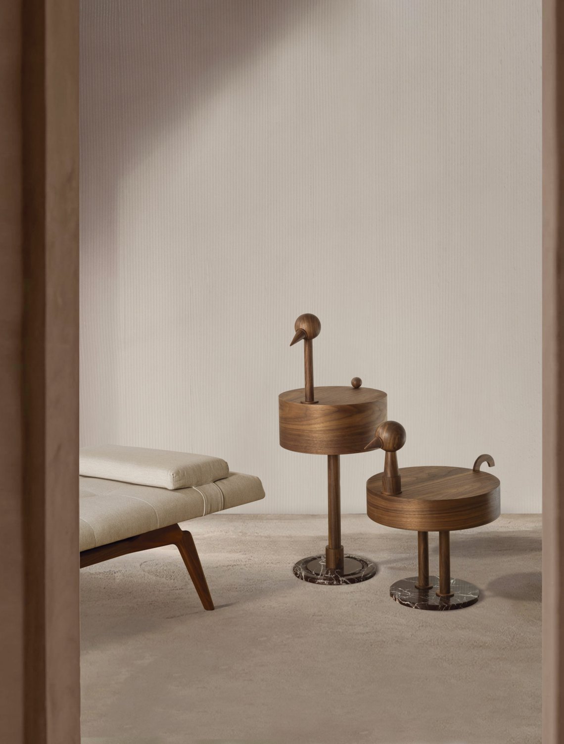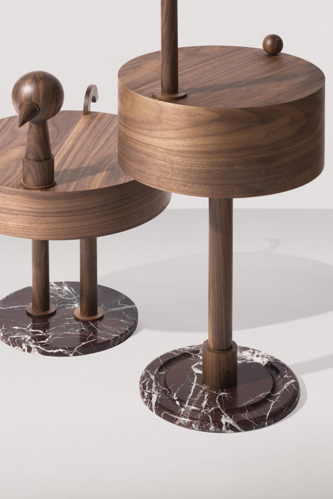 Rara Avis is a dialogue between art and design that transforms an everyday object into an artistic element. It combines geometric shapes in walnut wood with the formal refinement of Rosso Levanto marble. An eccentric object of cubist influence.