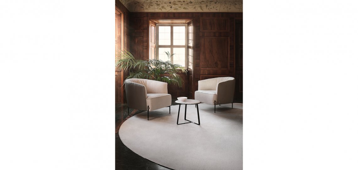 Diga, una sofisticata poltroncina dal linguaggio estetico ricercato e dalle linee avvolgenti, che offrono una sensazione di grande accoglienza, grazie alle imbottiture di seduta e schienale. Dettaglio inusuale sono i piedi di sostegno che escono dal corpo della seduta, posizionandoli esternamente alla struttura.