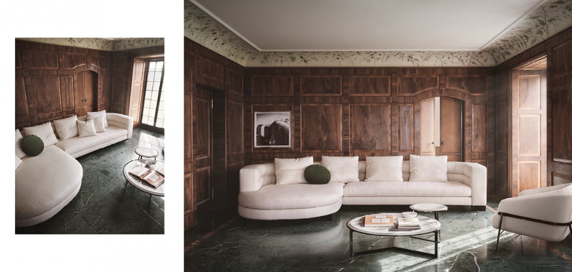 Linee classiche, schienale curvo e una particolare trapuntatura che corre lungo lo schienale, unito al dettaglio dei piedini in metallo, donano una sensazione di eleganza e raffinatezza che rendono il divano Aura adatto ad ogni ambiente. Grazie ai diversi moduli si possono creare composizioni lineari o a L per un comfort davvero su misura.