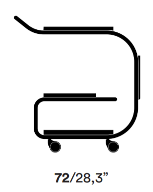 Tre vassoi in acciaio poggiano su una struttura sinuosa realizzata con sottili tubi d’acciaio, una pratica tasca in cuoio rigenerato trova spazio sul fronte mentre maniglia e ruote pivottanti rendono ancora più agevole lo spostamento di un prodotto nomade per definizione.