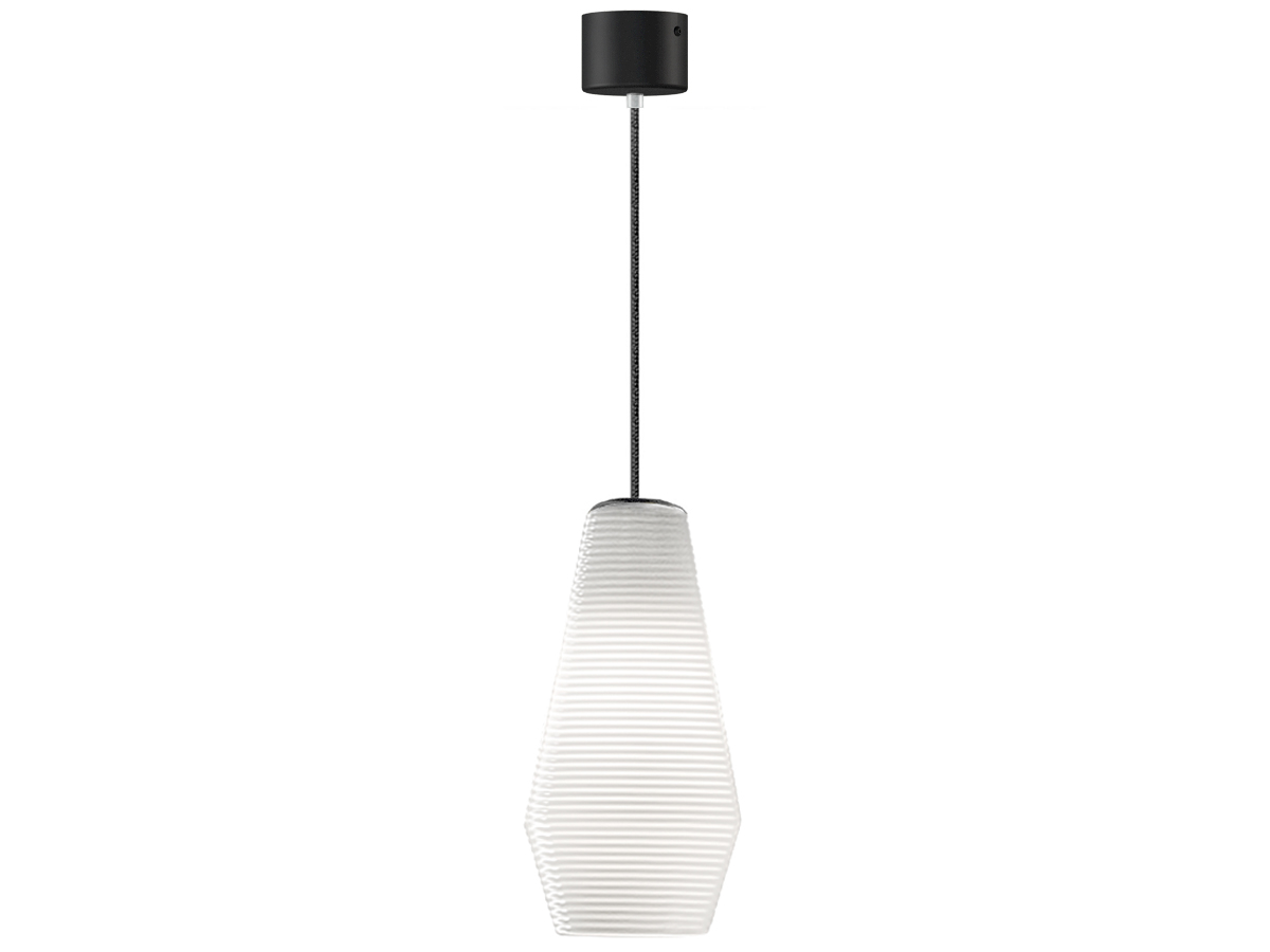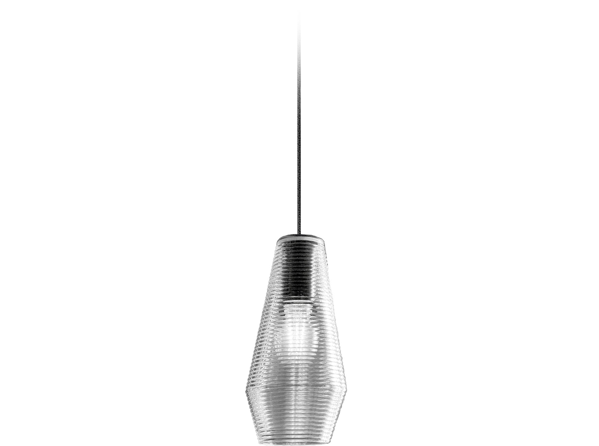 Lampada a sospensione in vetro soffiato con particolare finitura a coste dal gusto retrò. Rosone in metallo rifinito con vernice poliacrilica in color nero o nella nuova versione ottone satinato. Emissione di luce diffusa con attacco E27 e lampadina LED con filamenti a vista inclusa. Vetro soffiato disponibile in 7 colorazioni: cristallo, acciaio, ambra, bronzo, tabacco, verde e bianco lucido. Cavi elettrici in tessuto nero con possibilità di personalizzarne la lunghezza. Rosone a 8 uscite (+1 centrale). Ideale per strutture hospitality o zone living residenziali.
