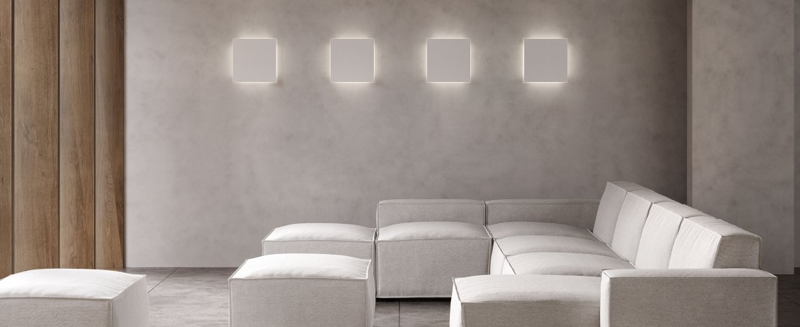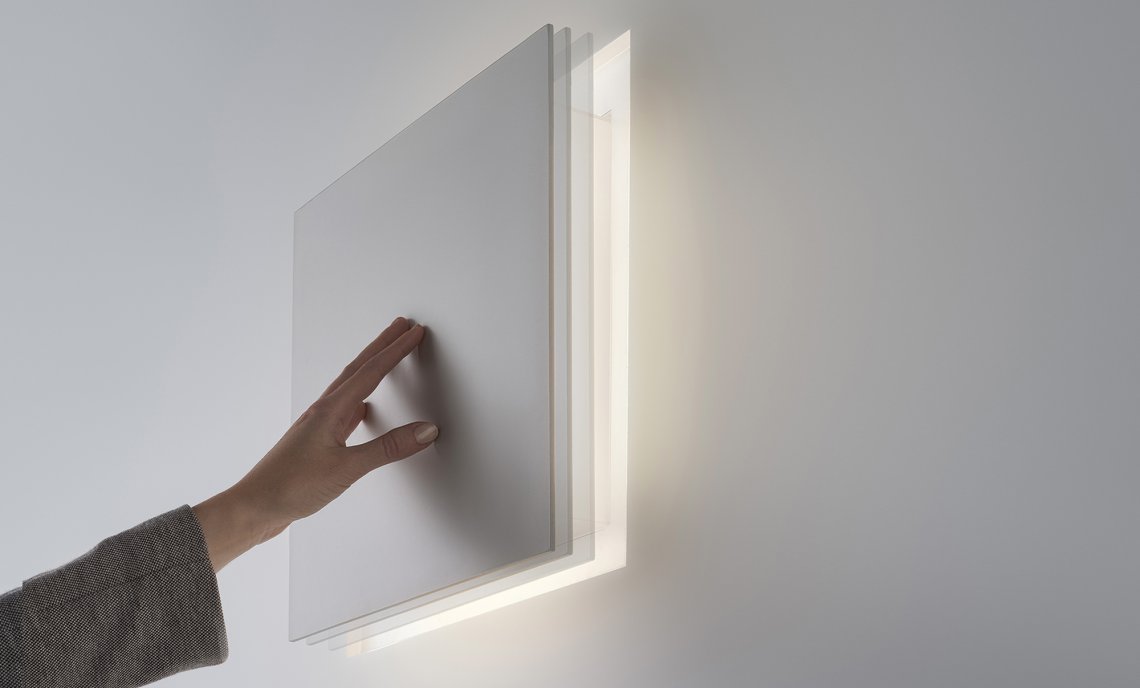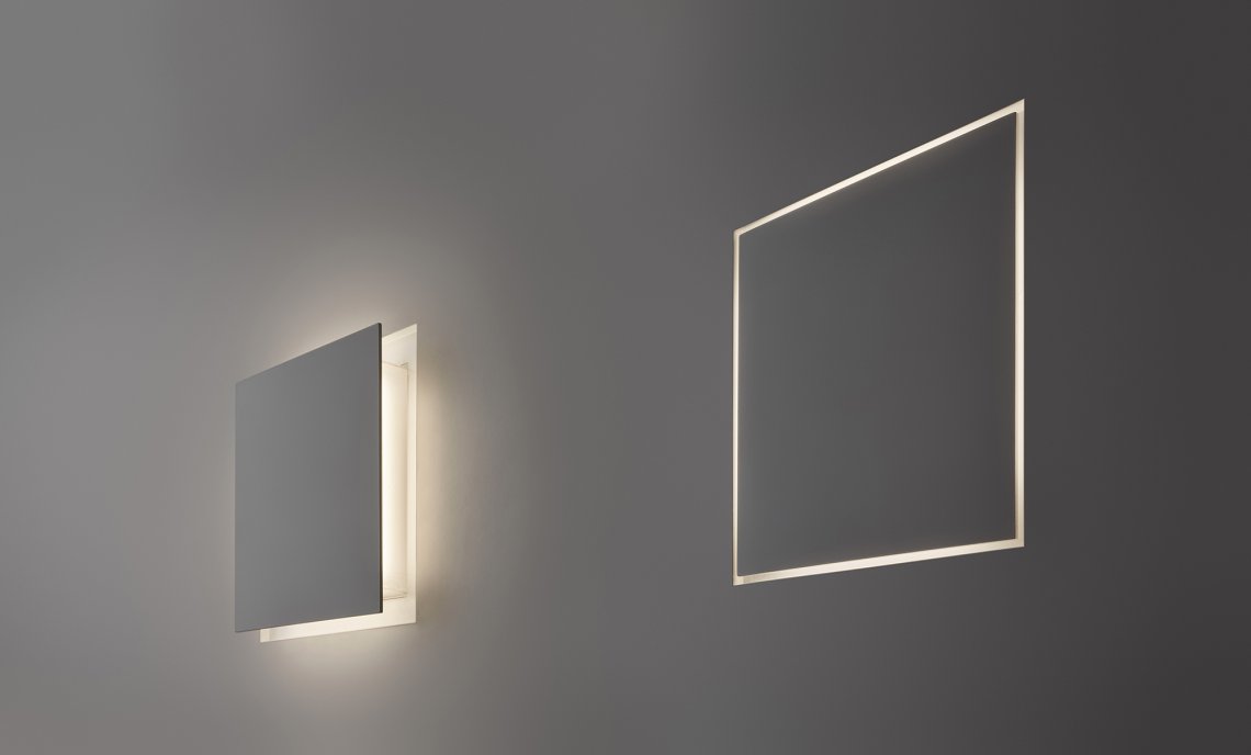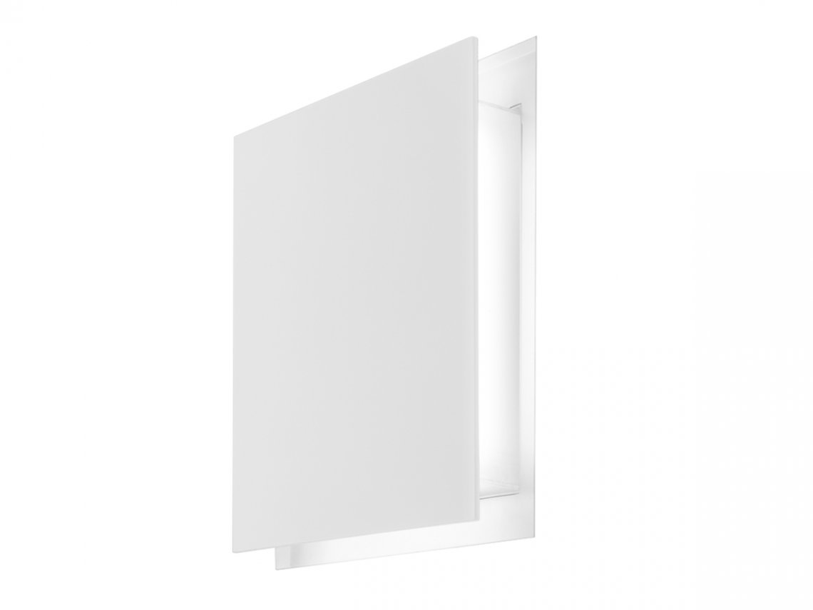 Wall-mount metal recessed trimless lamp with opening and closing click mechanism. Light source made of LED module with indirect light and integrated bi-level driver to reduce luminous flux and power consumption, creating a luminous perimetral frame, when closed. Finish in white polyacrylic paint. Ideal for bedrooms, living areas and to create composition on wide walls.