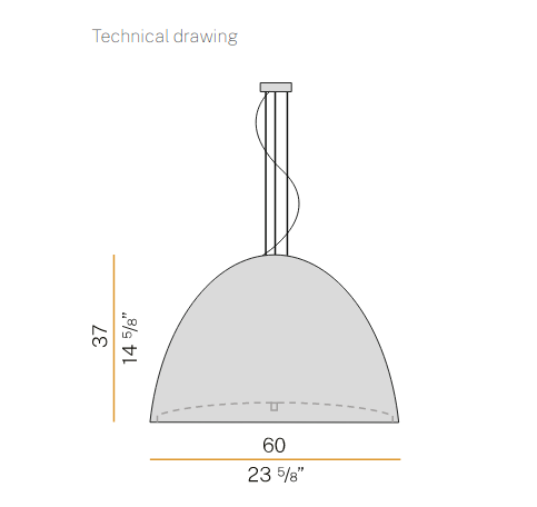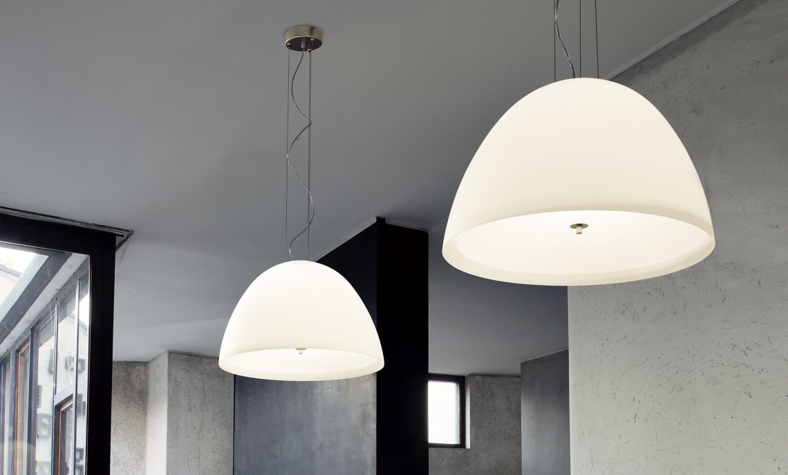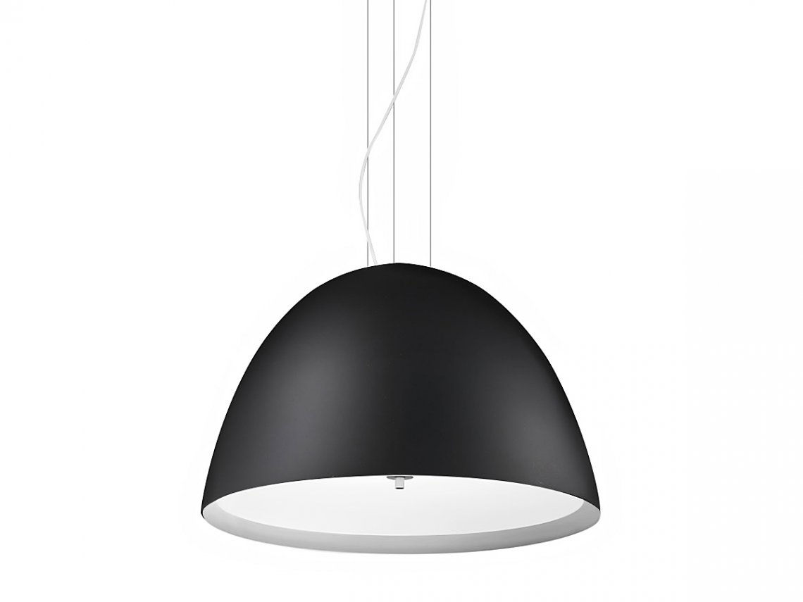 Suspensions in white blown or black painted glass, ? 40cm, ? 50cm and ? 60cm with glass sheet as diffuser. Fittings in metallized grey metal.