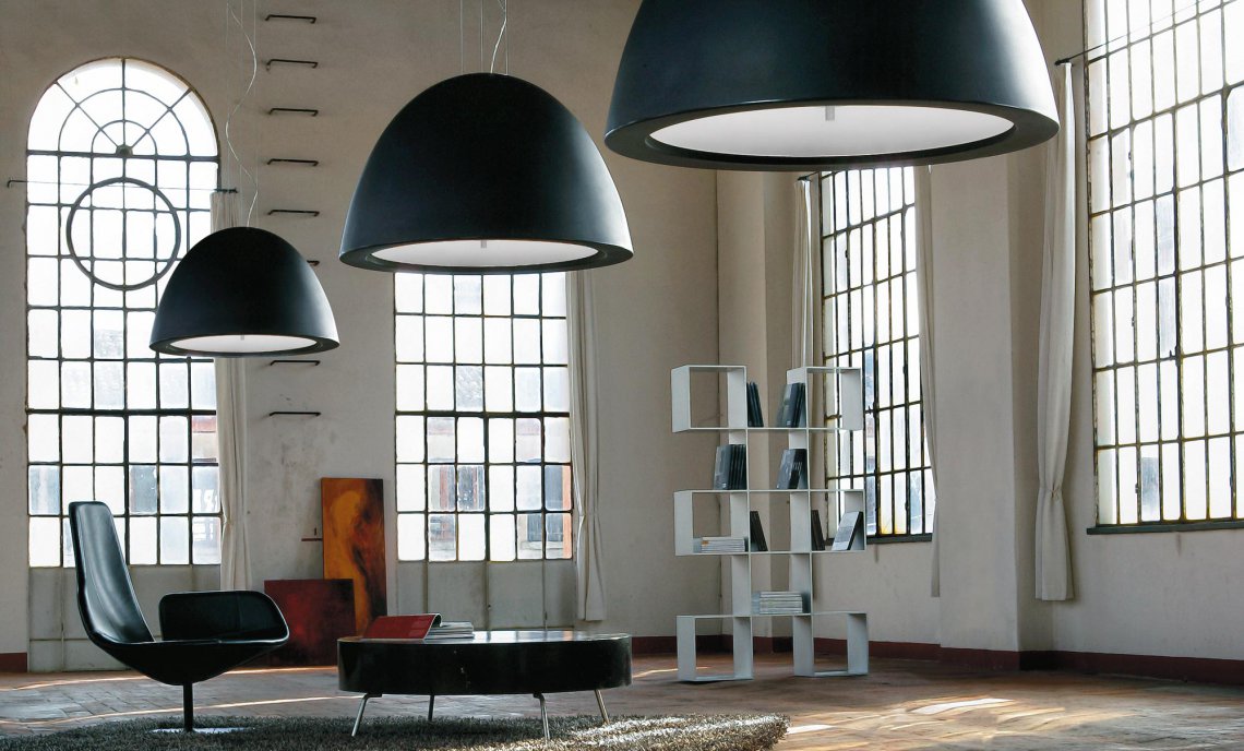 Suspensions in white blown or black painted glass, ? 40cm, ? 50cm and ? 60cm with glass sheet as diffuser. Fittings in metallized grey metal.