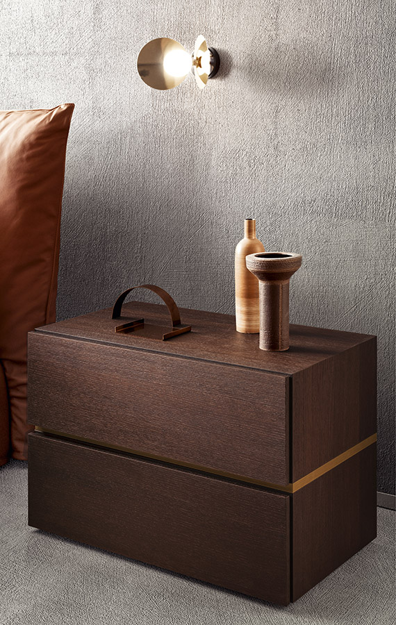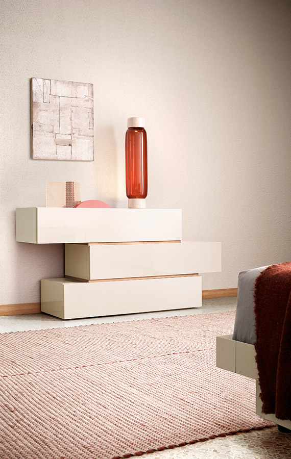 With its elegant, linear design People is a range of chests-of-drawers and bedside units offering multiple options in terms of arrangements, dimensions and styles. Straight or off-set, floor-standing or wall-hung, they furnish the bedroom with their modern, refined appeal. A glamorous touch is afforded by adding lacquered, metallic or wooden inserts to arrangements. The fronts are handle-less and provided with side channels to open the drawers.
