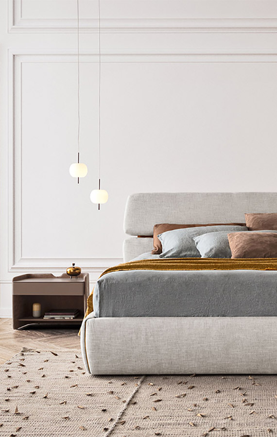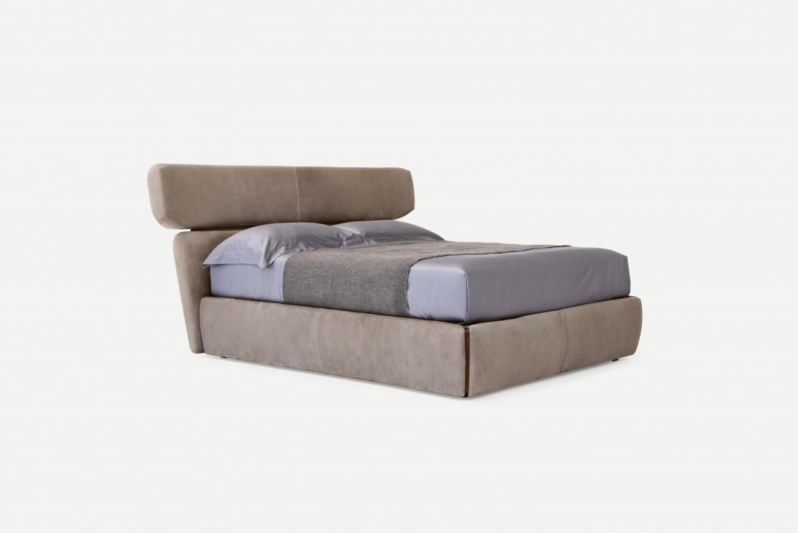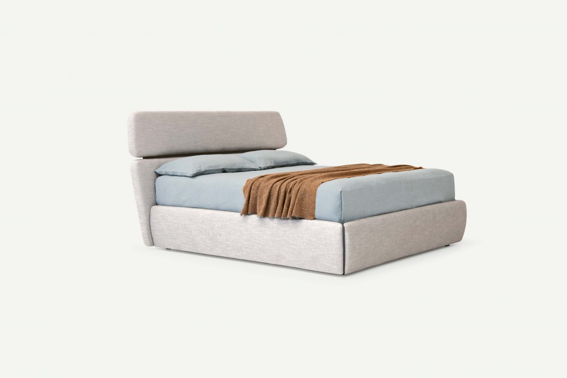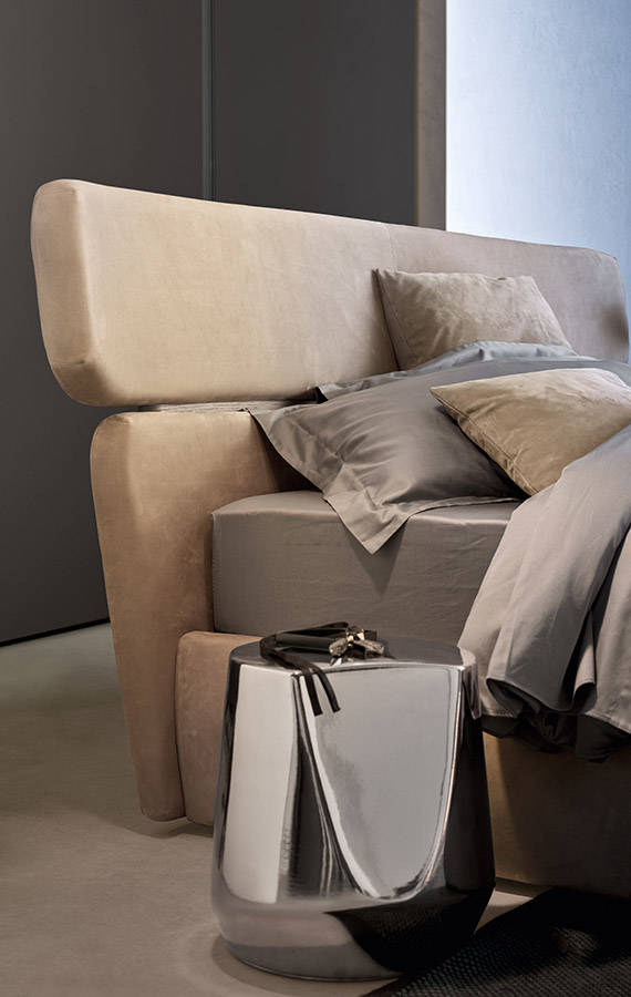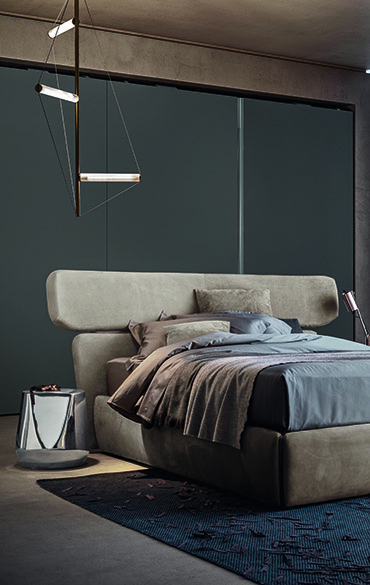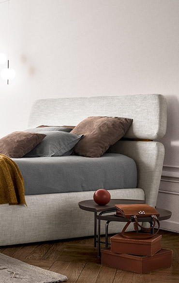 Audacity and an innovative spirit make for design with a modular personality. Bold, modern shapes softened by rounded edges are interrupted by very decorative spacers available in wood or with a lacquered or metallic finish. The are three design options for the headboard: low for the Base version, high with a double trapezoidal panel for the Rialto Diritto model and stately and curved for the Large version. The whole frame is padded and upholstered in removable fabric, leather or man-made leather.