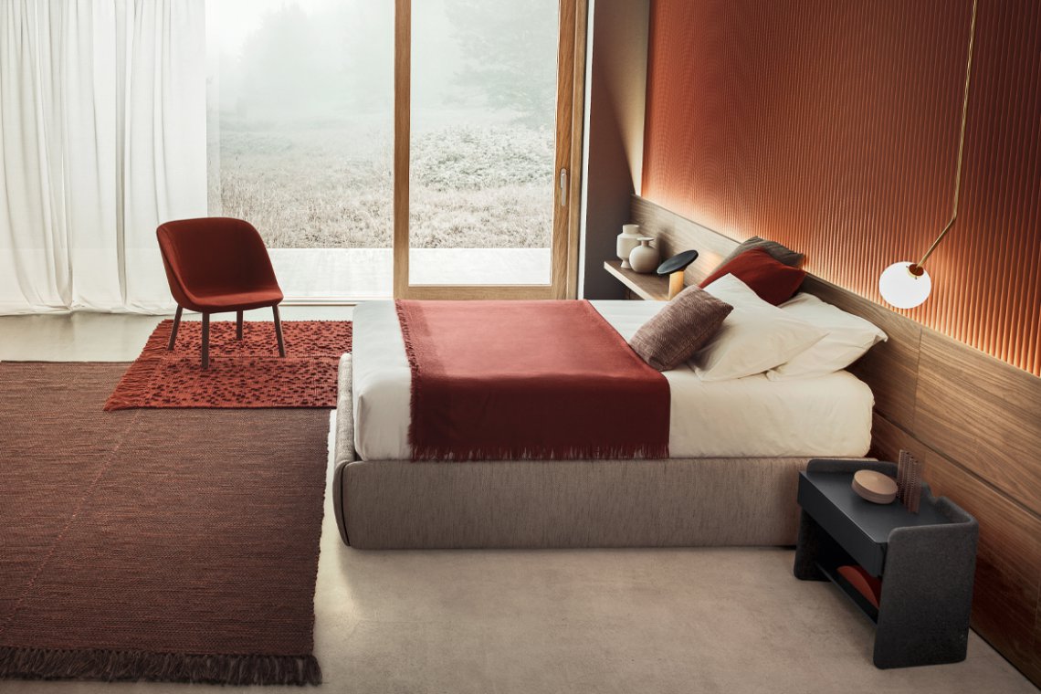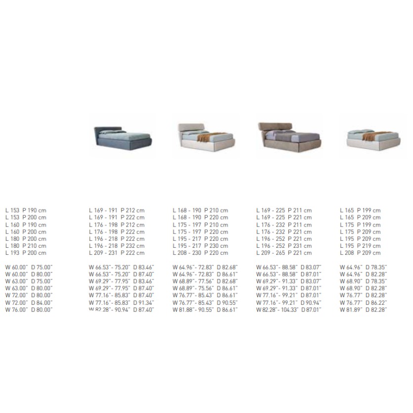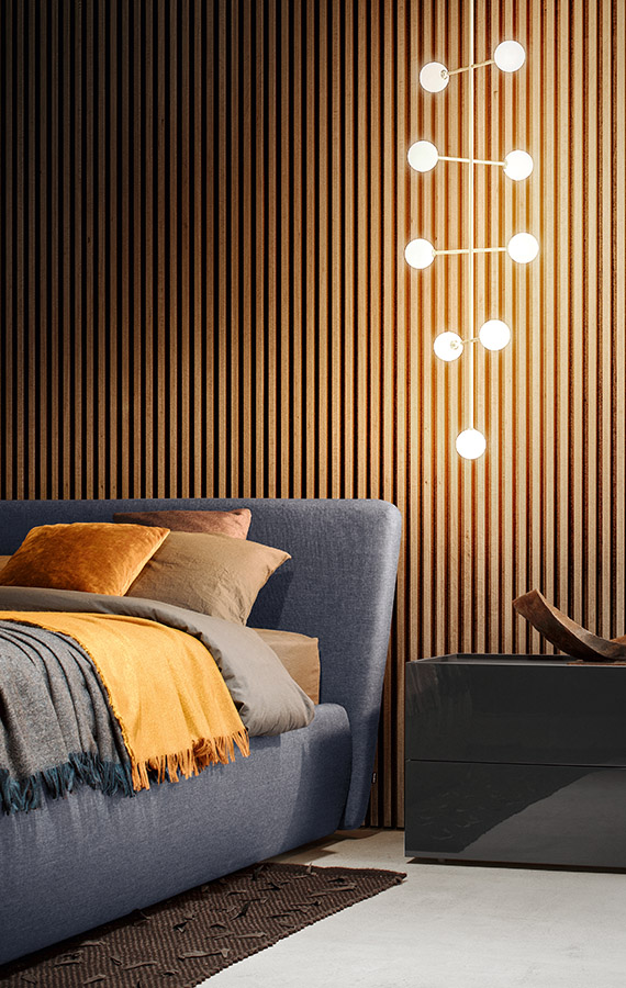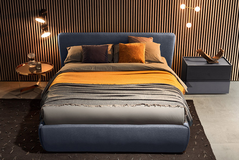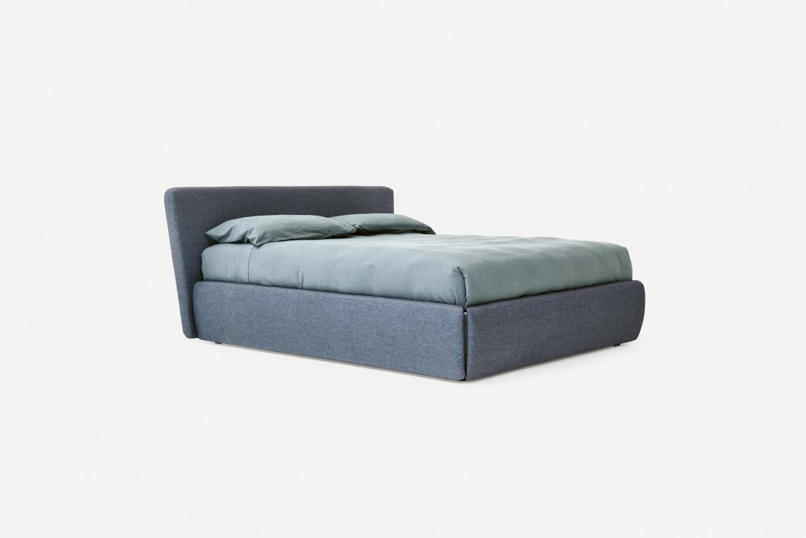 Audacity and an innovative spirit make for design with a modular personality. Bold, modern shapes softened by rounded edges are interrupted by very decorative spacers available in wood or with a lacquered or metallic finish. The are three design options for the headboard: low for the Base version, high with a double trapezoidal panel for the Rialto Diritto model and stately and curved for the Large version. The whole frame is padded and upholstered in removable fabric, leather or man-made leather.